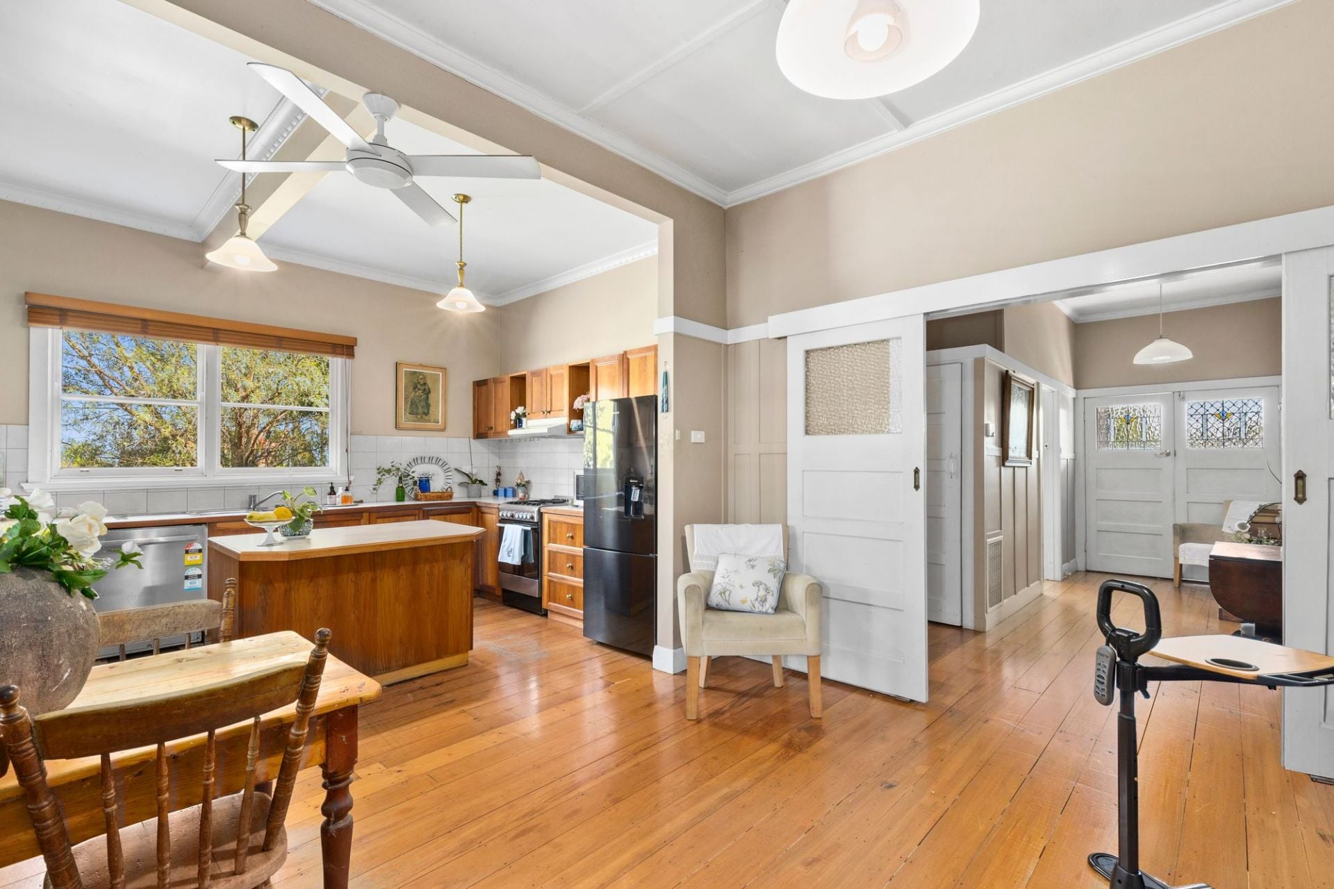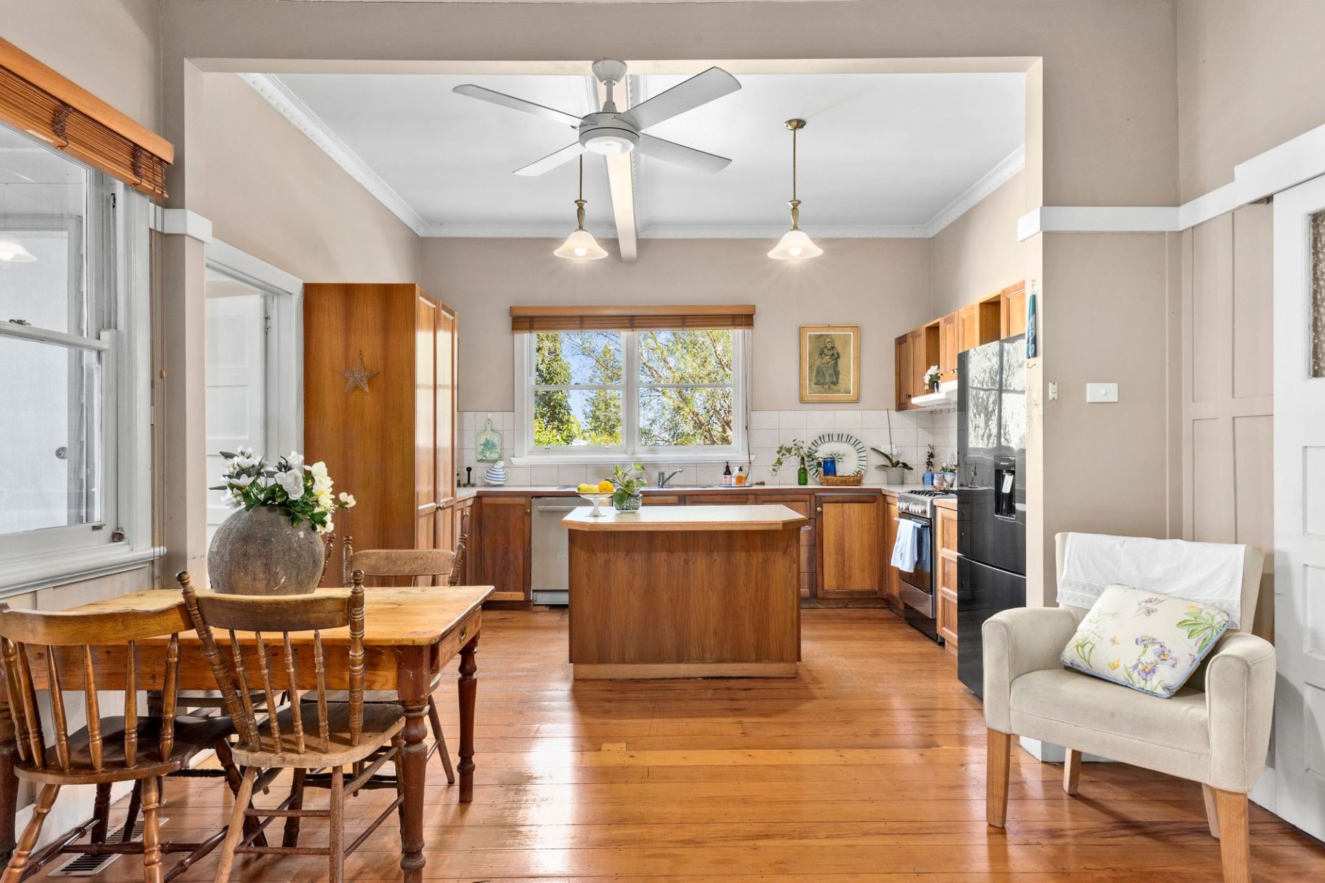As you step inside the front gate, you’ll instantly fall in love with the sense of old-world charm. Soaring ceilings and polished floorboards enrich the interiors, with beautifully-retained period details including leadlight windows and decorative ceiling plaster. The front lounge overlooks the rose garden, while the open plan living/dining/kitchen zone creates the centrepiece of the home. The kitchen exudes rustic charm with timber cabinetry, a stainless-steel dishwasher and oven/gas cooktop.