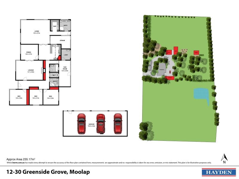 Three bedrooms are complete with built-in robes and share close access to the bathroom with spa bath and separate shower room. A sunroom, atrium, and laundry complete the floorplan.