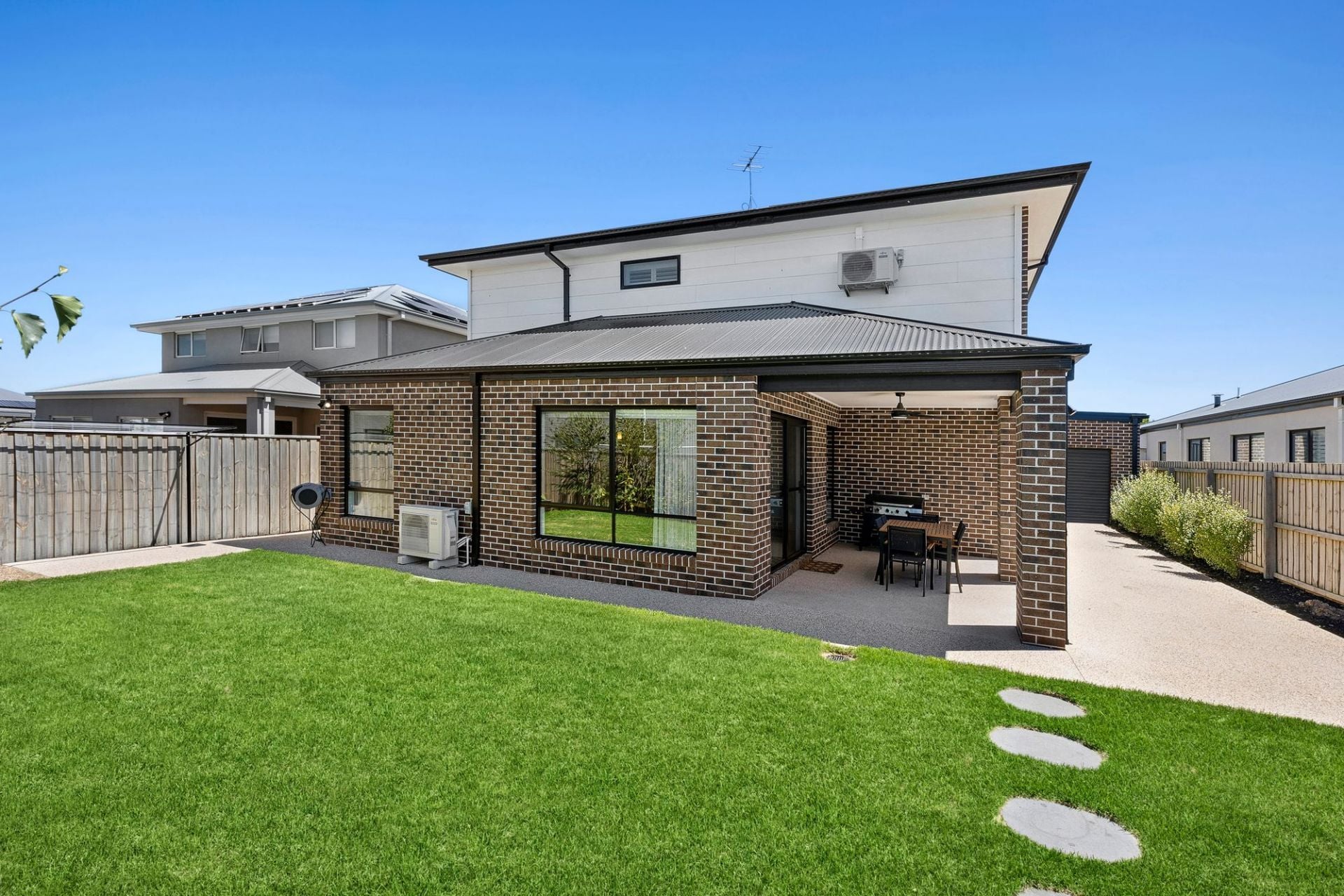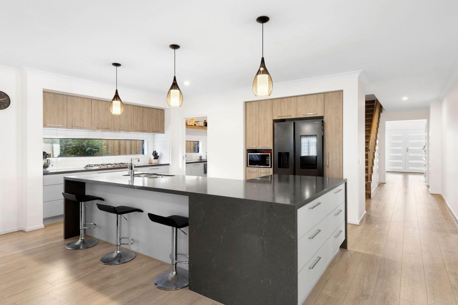 The kitchen is built to cater for a full house, featuring dark stone benchtops, an extra-wide Smeg cooktop, and a brilliant butler's pantry with a second sink, large prep zone and ample storage. Flowing out from the kitchen, the open plan living and dining zone extends seamlessly to the covered alfresco terrace, with a lush lawn and landscaped screening for privacy.