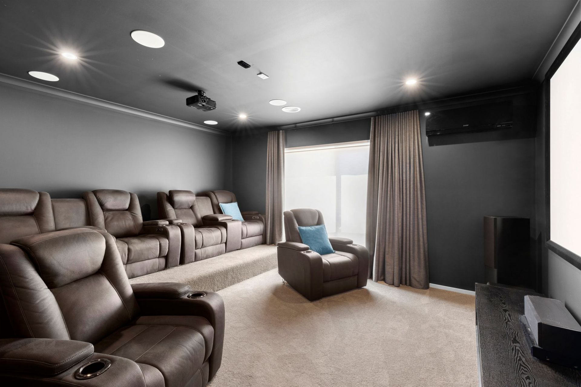 Upstairs, a second lounge or rumpus room with balcony access provides a distinct space for a teenagers' retreat or younger child's play area, while the darkened media room is fully equipped with a projector, surround sound, and tiered flooring for an authentic home theatre experience. Zoned ducted gas heating, solar hot water, and reverse cycle air conditioning in every room ensure year-round comfort.