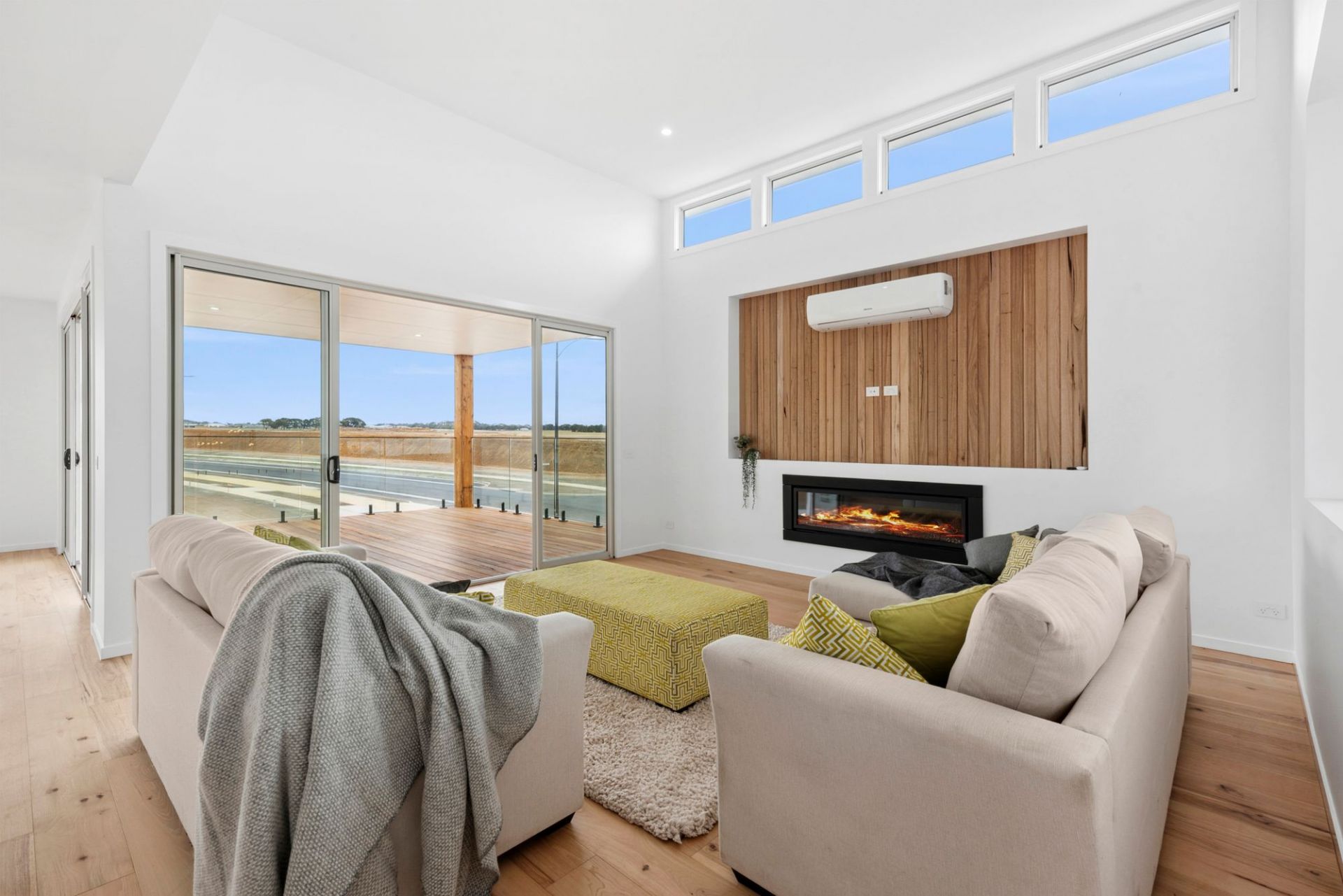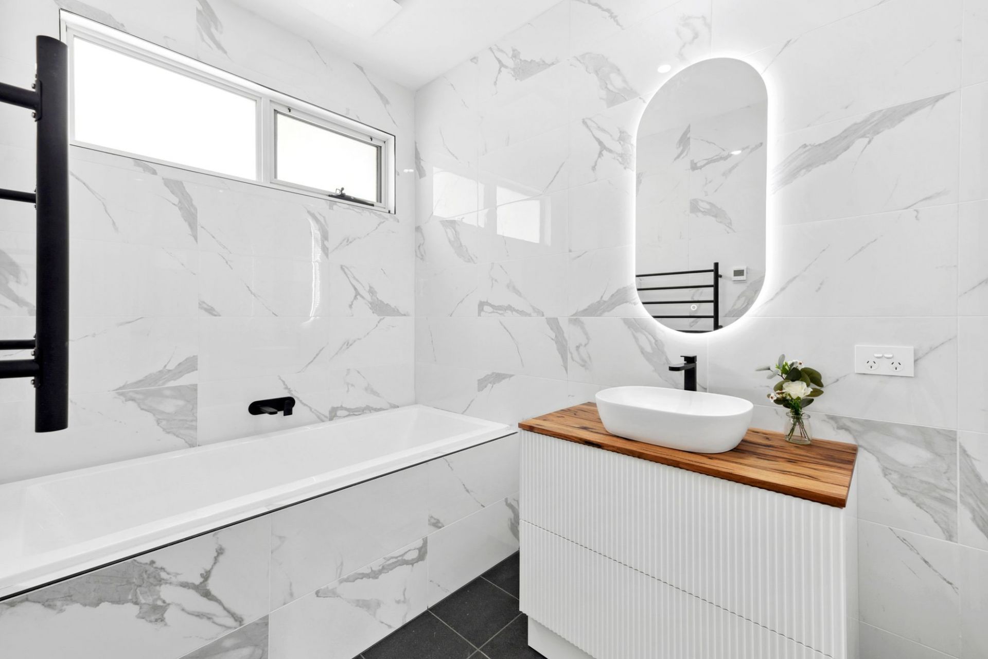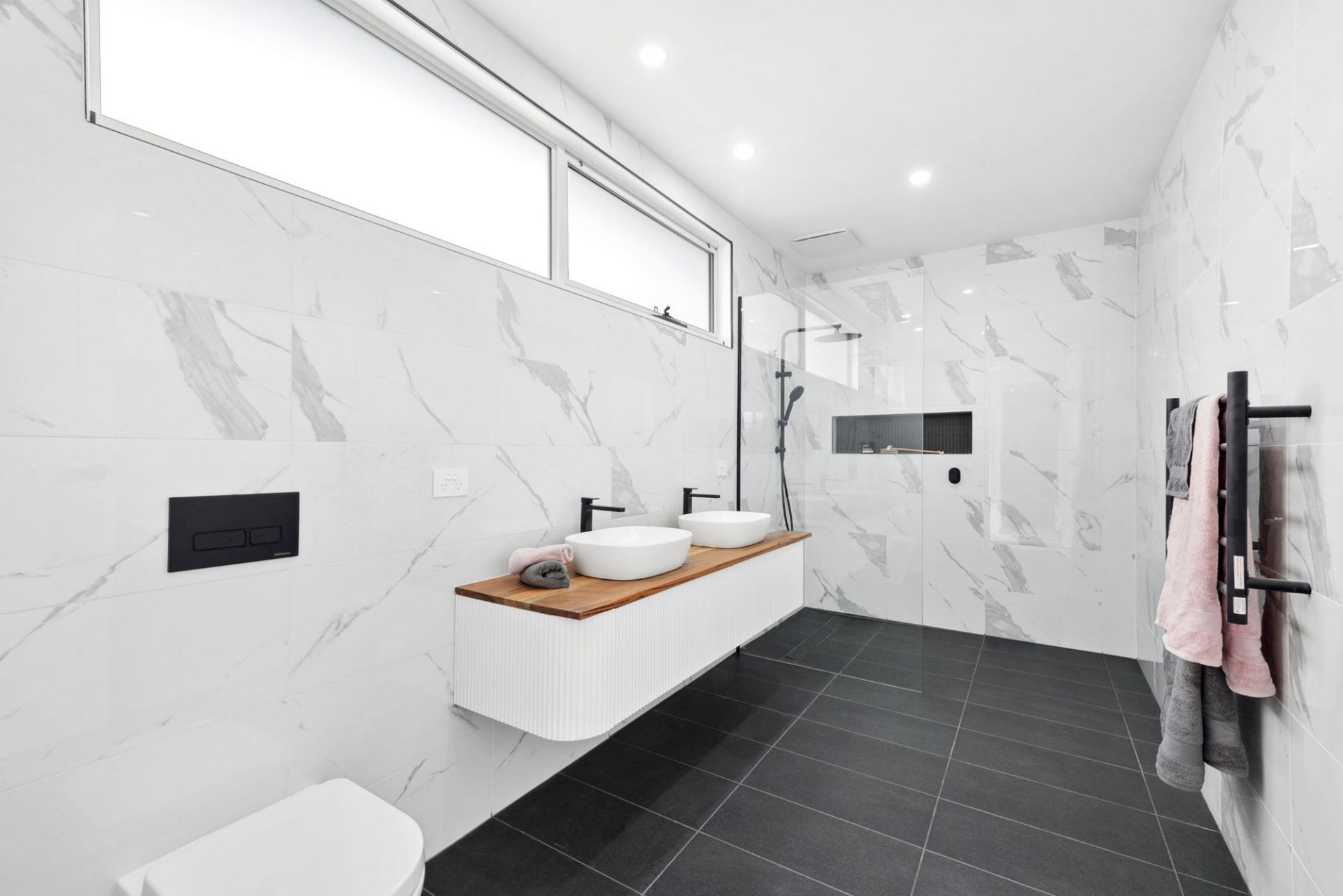 Every bathroom includes under-tile heating and heated towel rails. Additional features include hardwood floors, Earthwool insulation, two gas log heaters, four split systems, a 5kW solar system, and full security system.