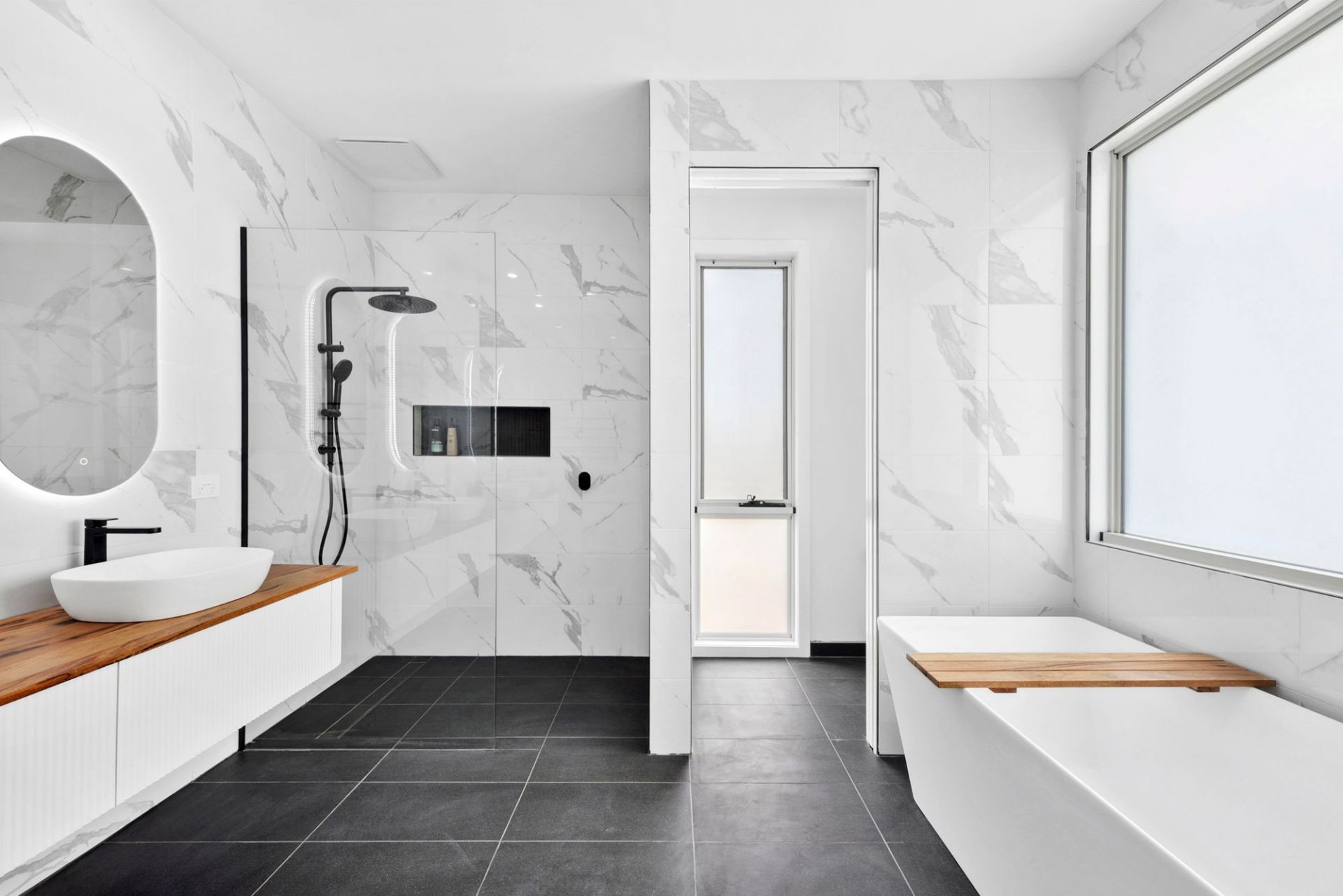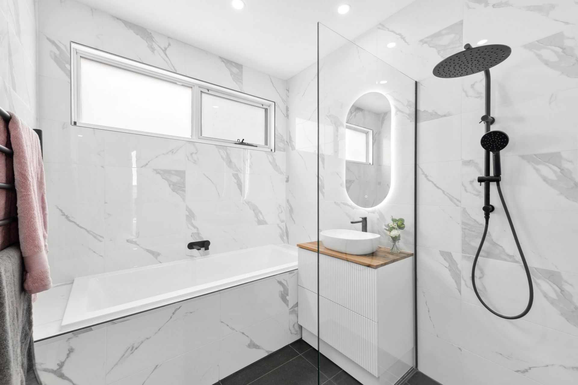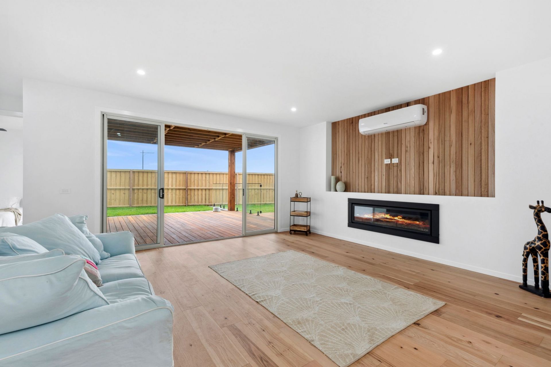 Every bathroom includes under-tile heating and heated towel rails. Additional features include hardwood floors, Earthwool insulation, two gas log heaters, four split systems, a 5kW solar system, and full security system.