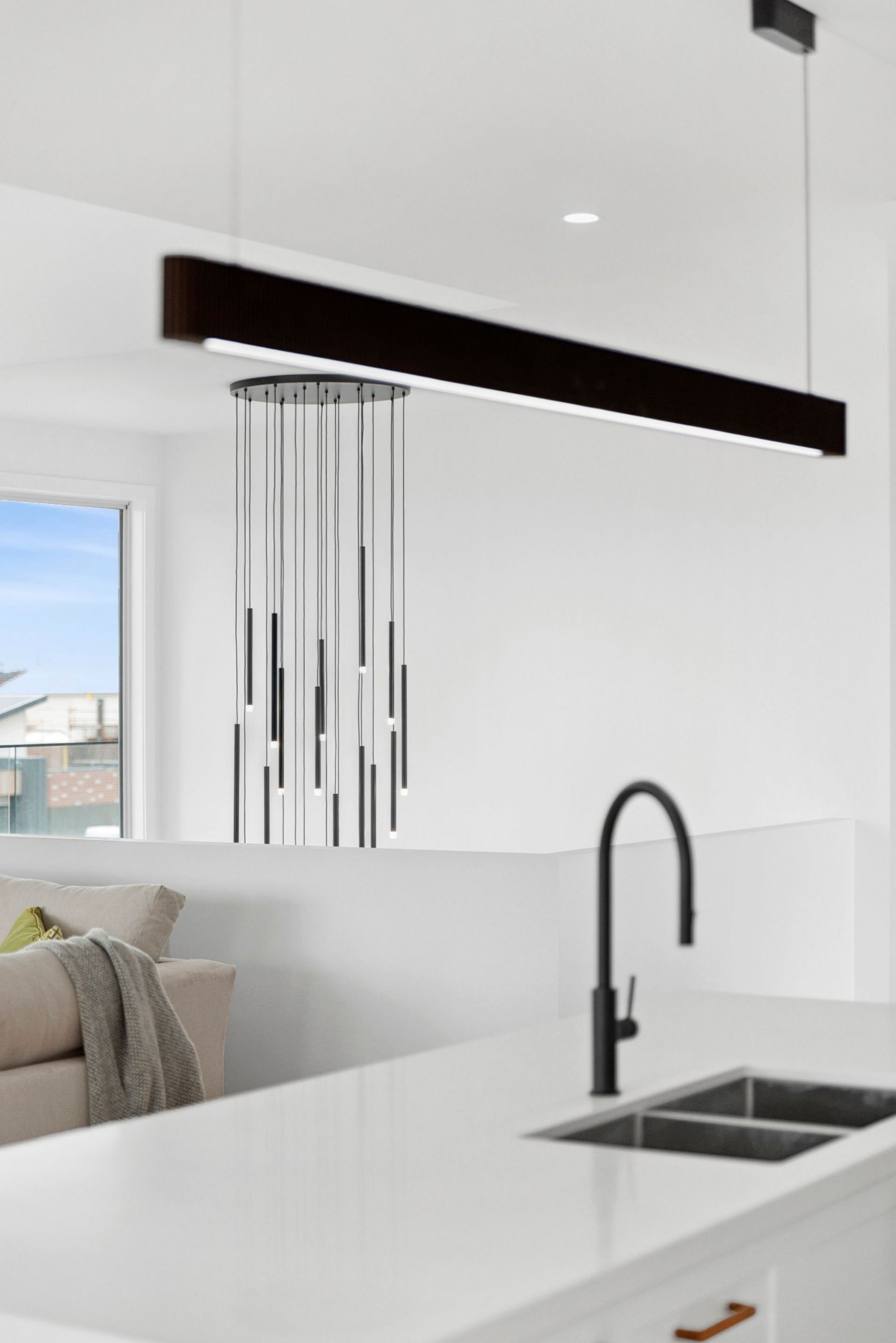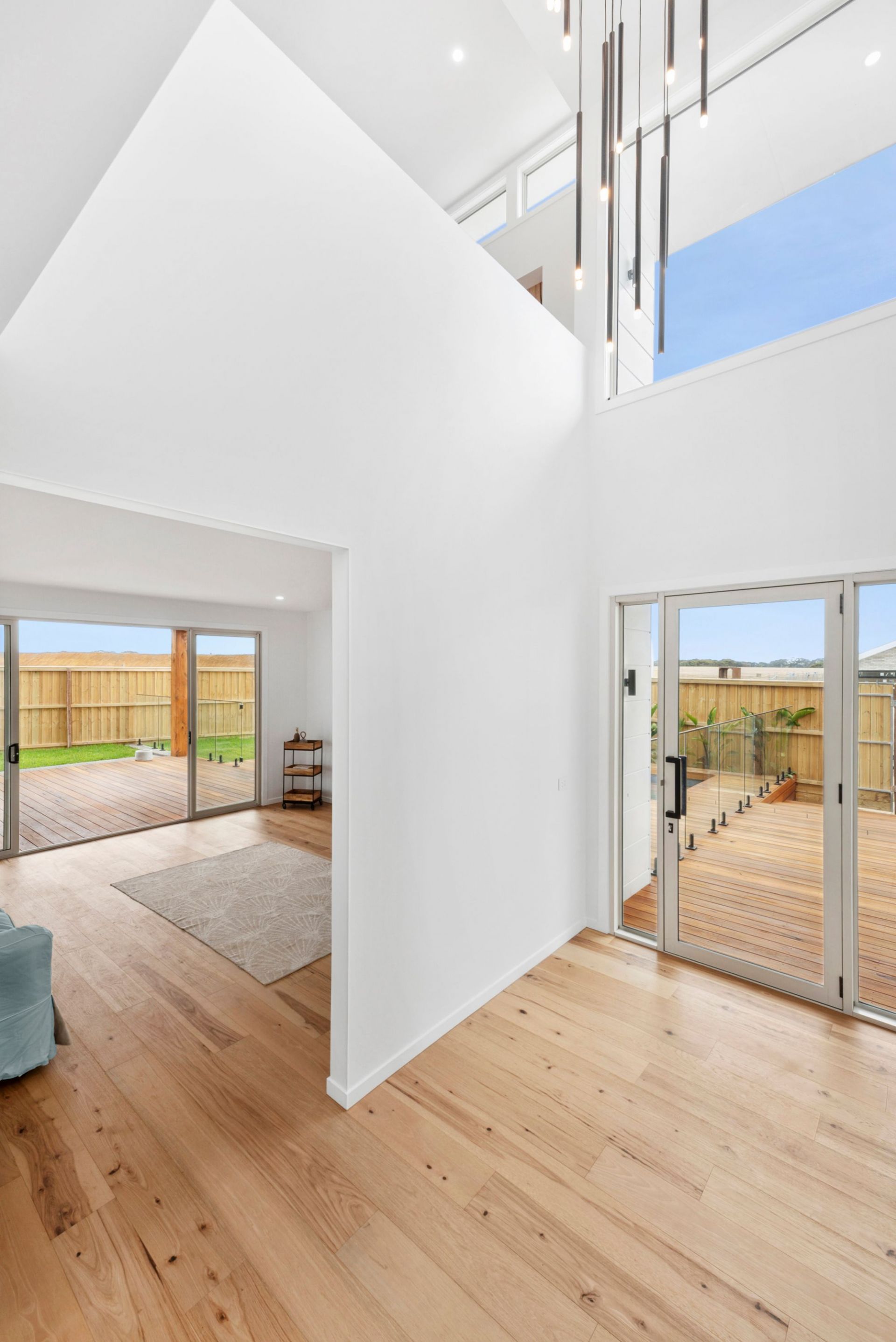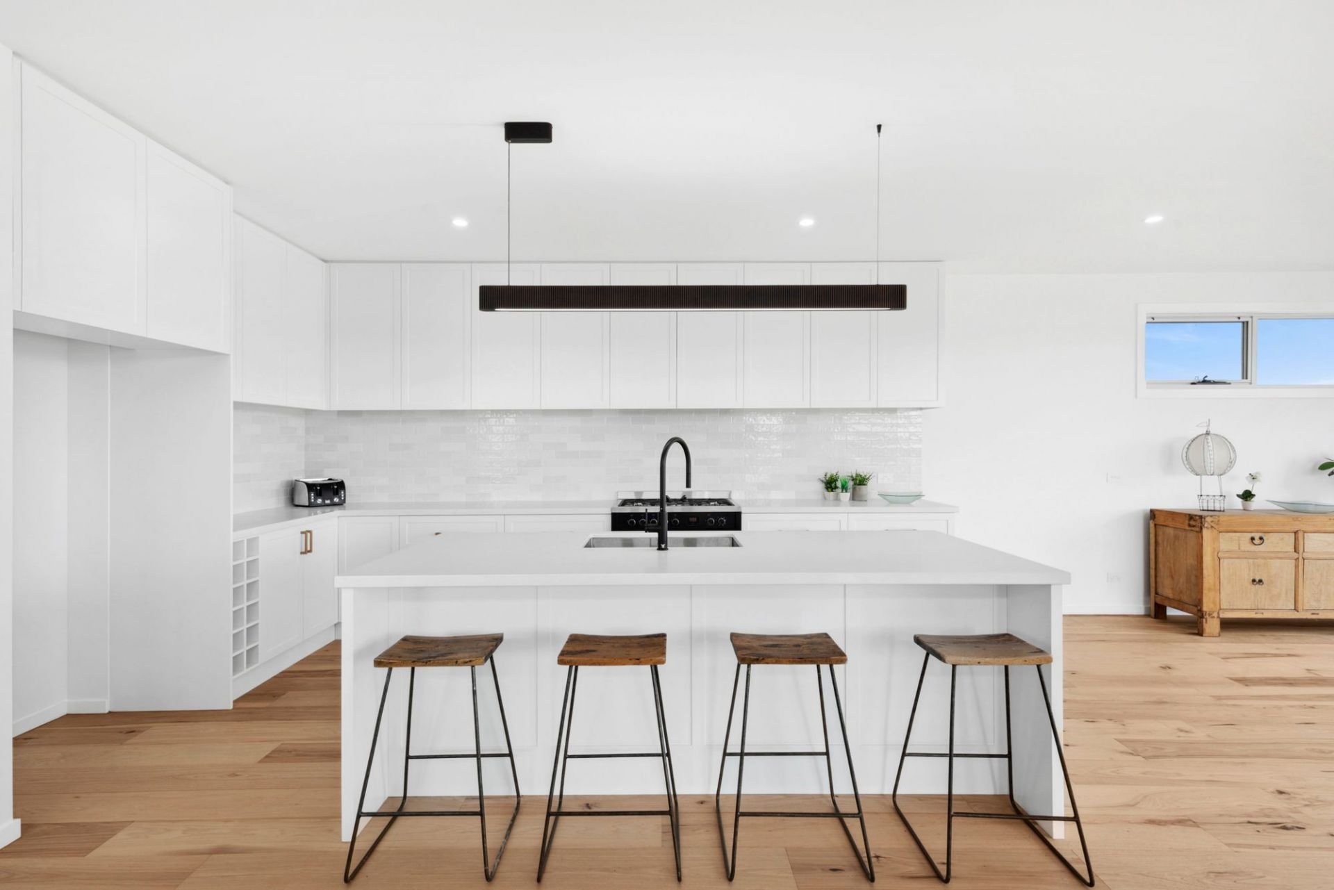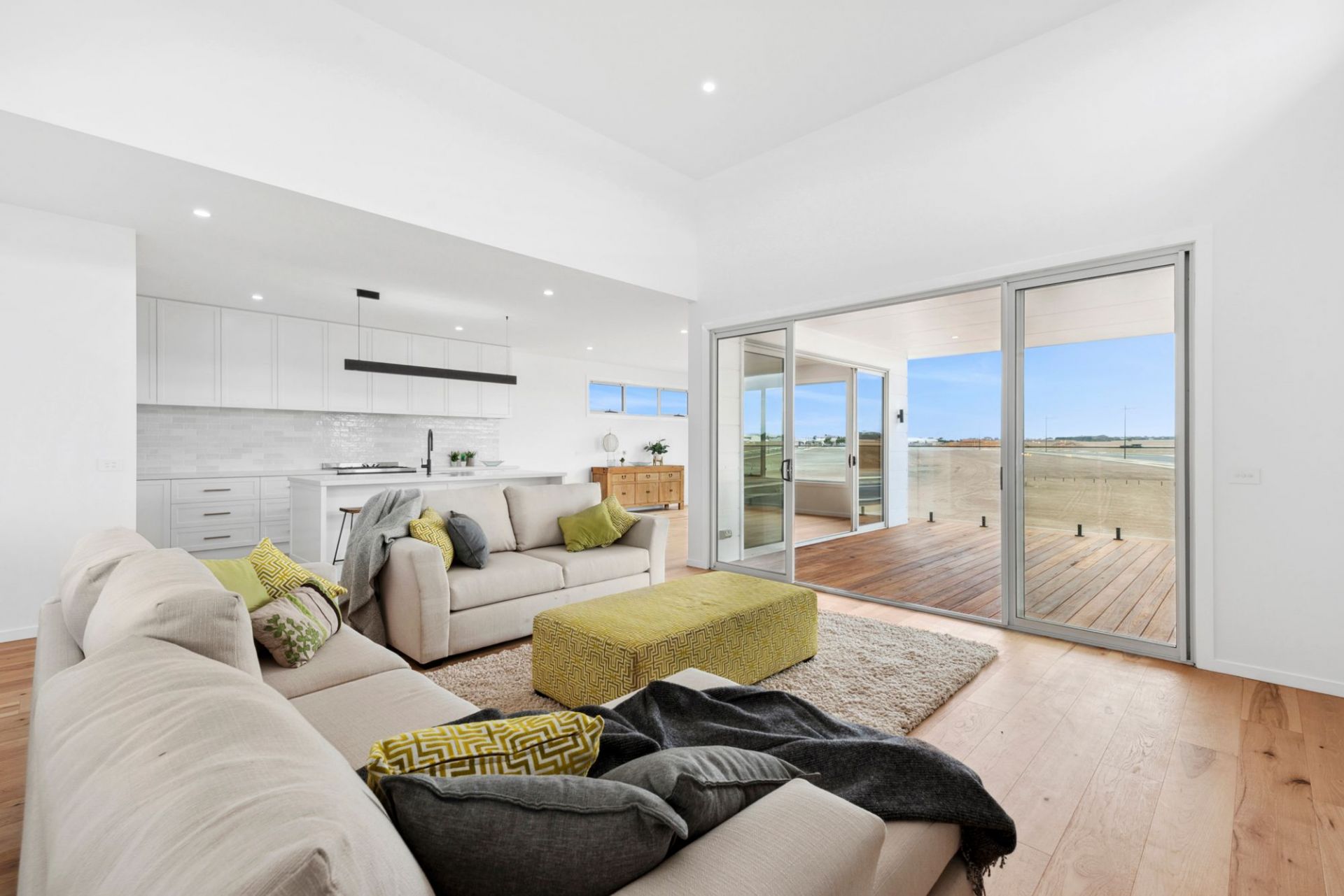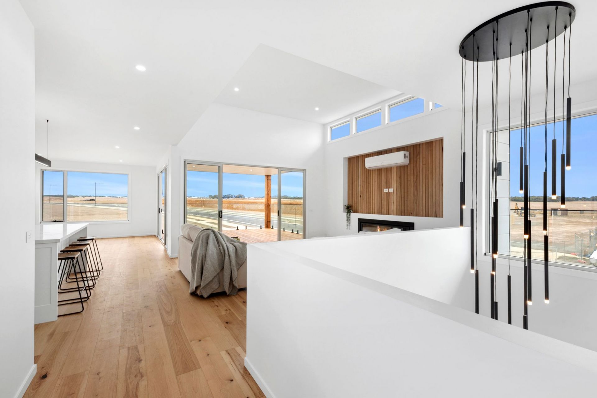Upstairs, the sunlit open-plan living, dining and gourmet kitchen connect to a balcony with sunrise and sunset views over farmland. The kitchen boasts Caesarstone benchtops, a 900mm gas cooktop, oven, dishwasher, built-in fridge cavity and ample storage.
