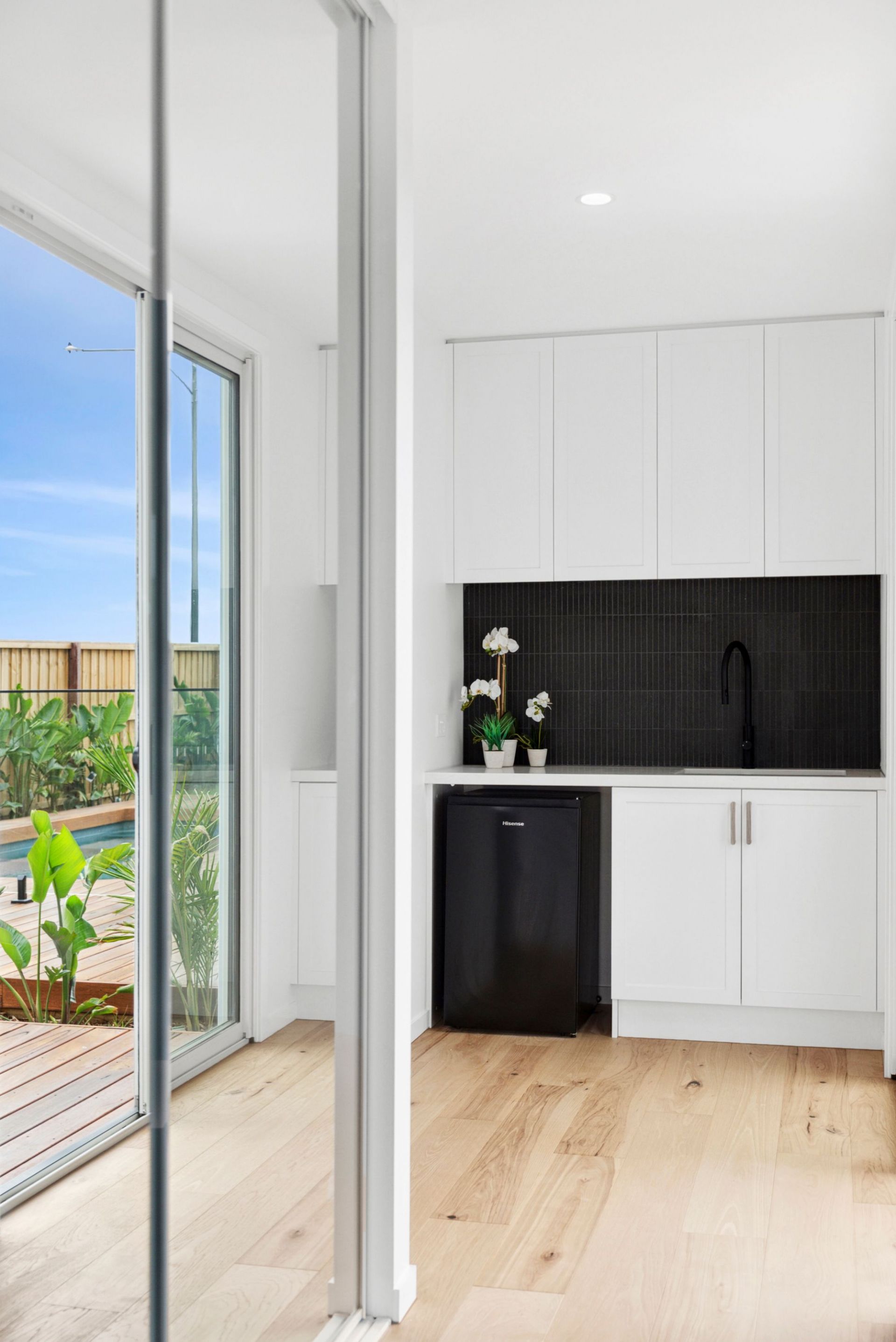 A self-contained ground-floor retreat includes a bedroom or office, ensuite with double vanity, private kitchenette, courtyard, and separate entry-ideal for in-laws, teens, or a home business.