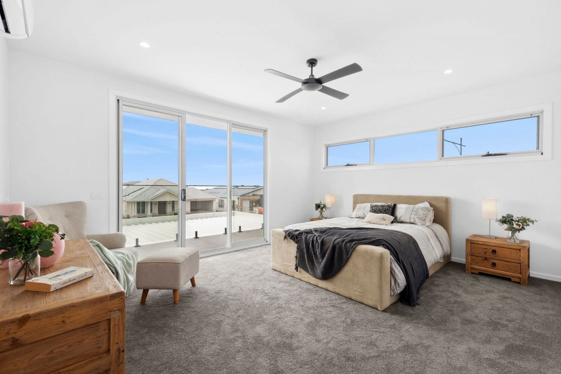 The master suite features a walk-in robe and ensuite with under-tile heating, freestanding bath, marble-effect tiles, double vanity, heated towel rails, and separate toilet. A fifth bedroom with balcony access enjoys nearby bathroom facilities. All four bedrooms have wall to wall mirrored wardrobes and carpet with veranda access.