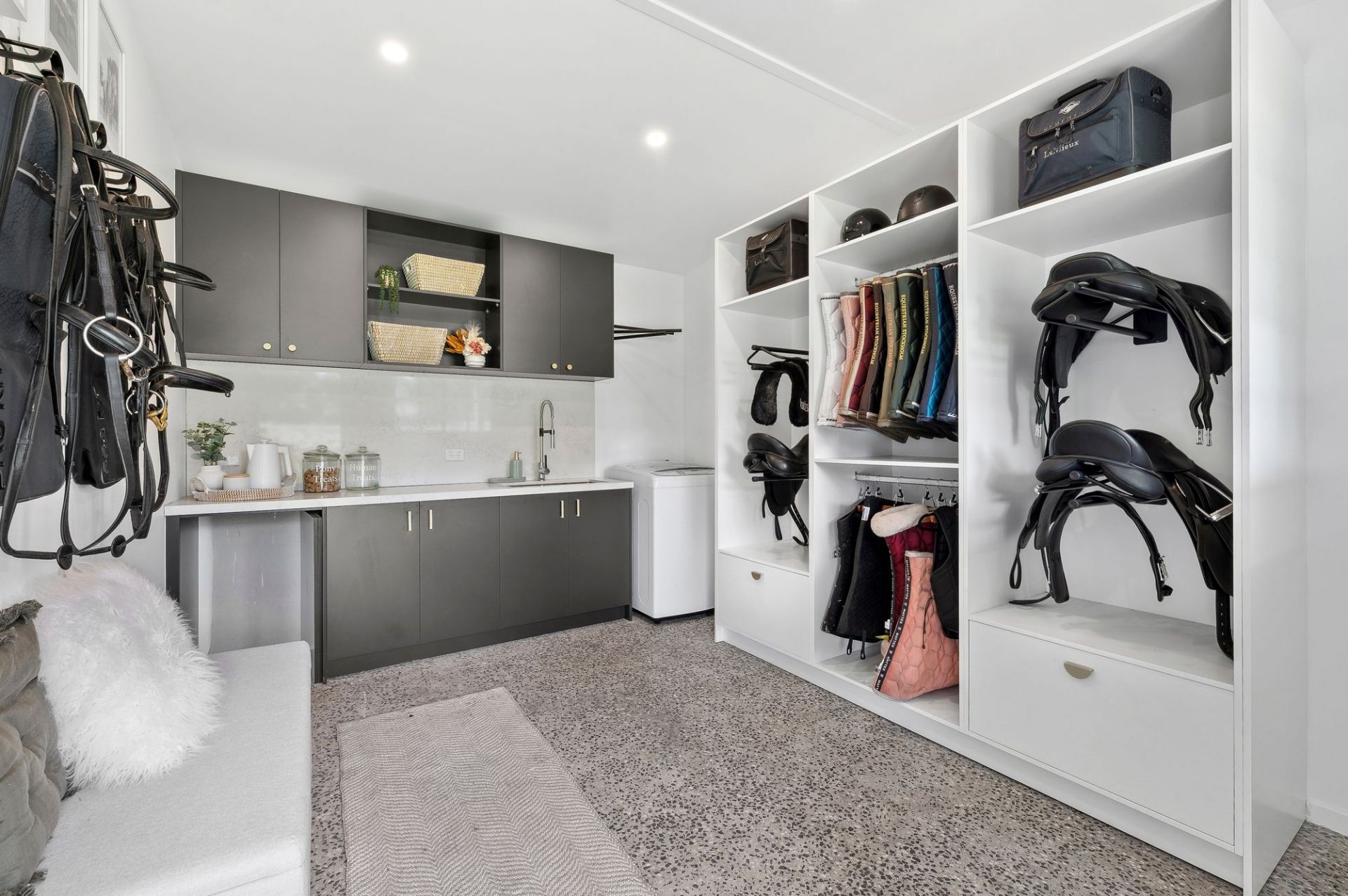 Horse people will appreciate the two horse paddocks with near-new all-weather PVC and electric fencing, including one with a rubber-lined horse shelter, and the half-size dressage arena alongside an immaculate tack room, wash station/stables area and a pristine feed room.
