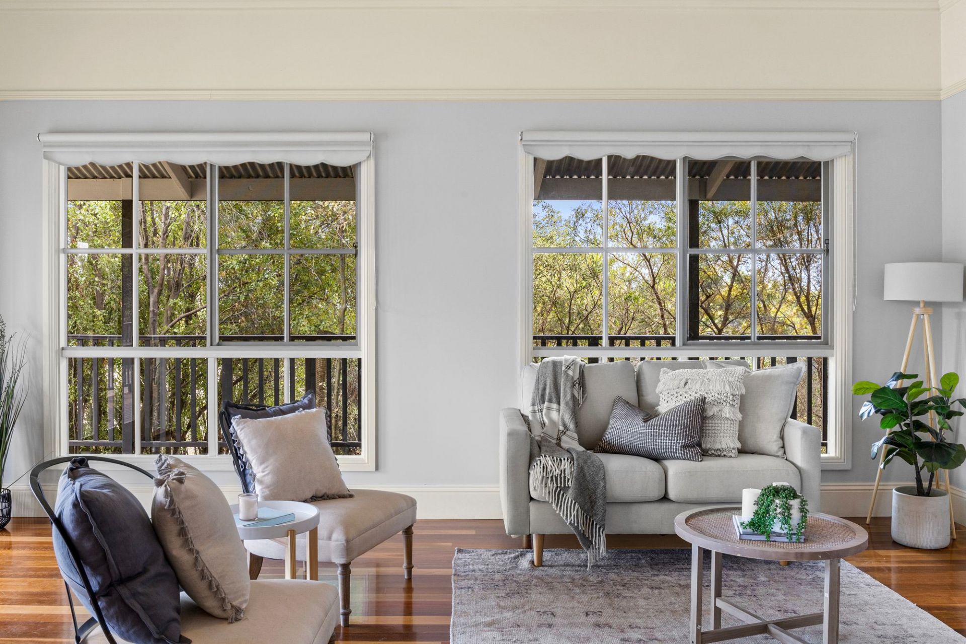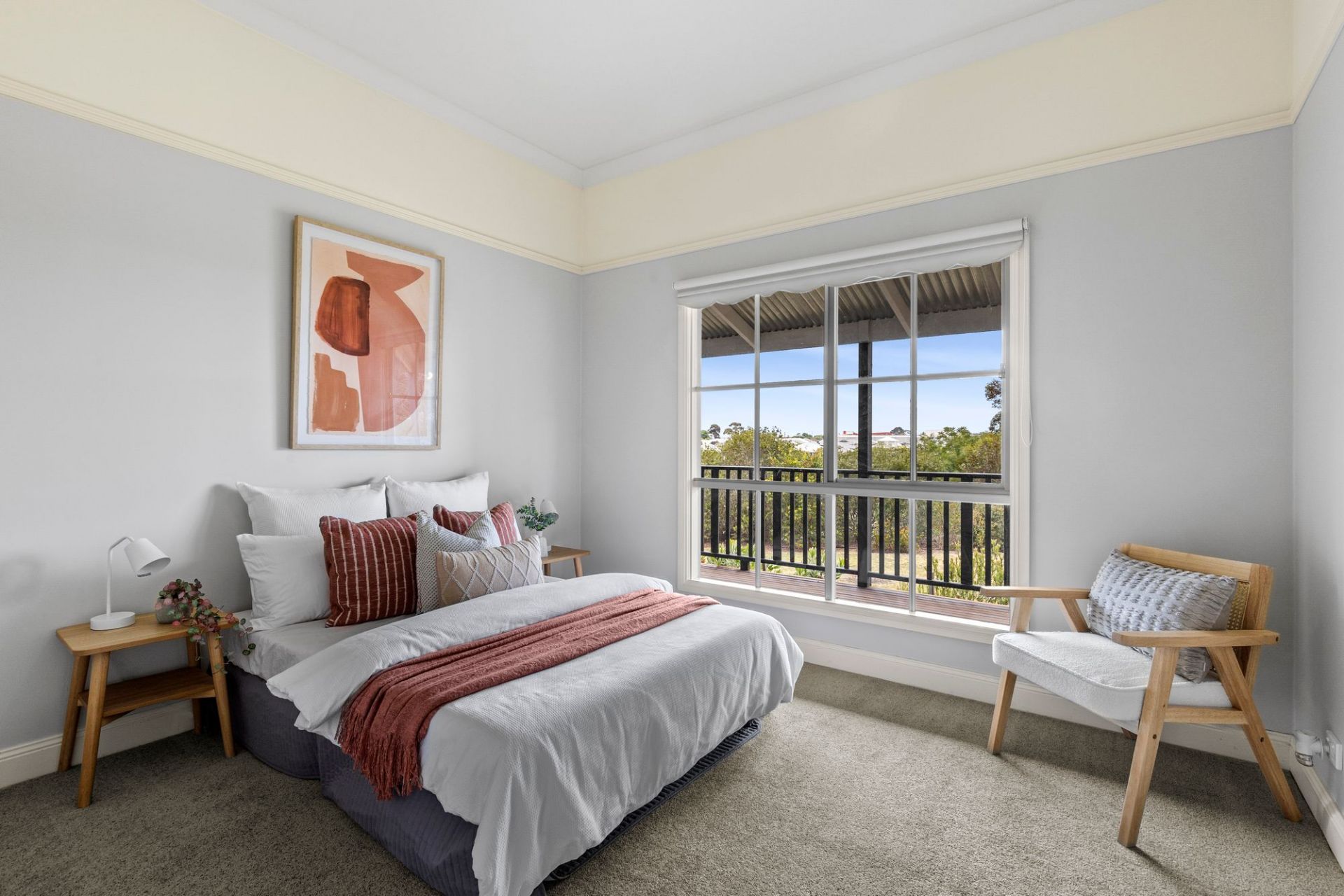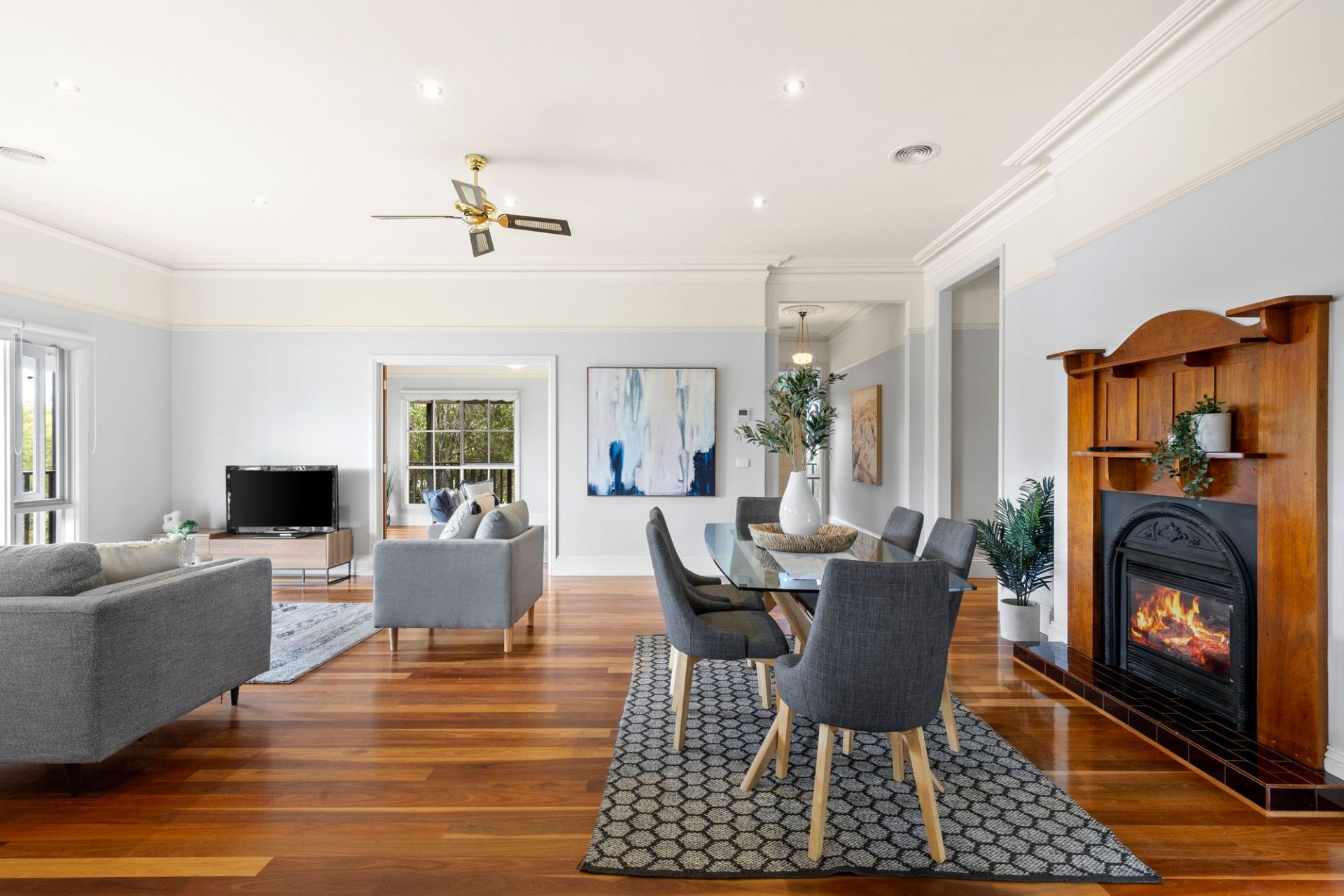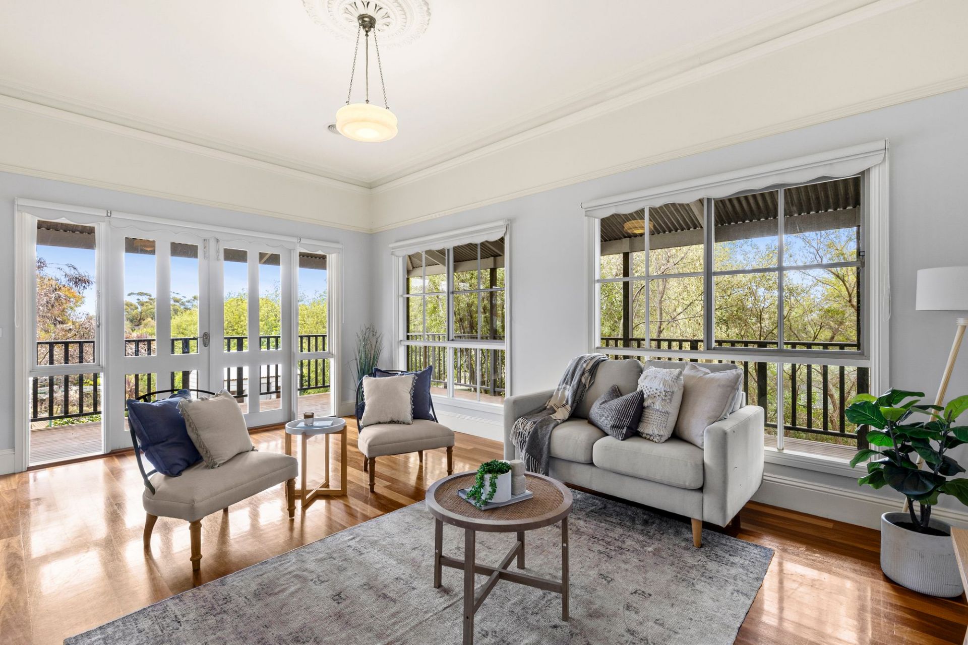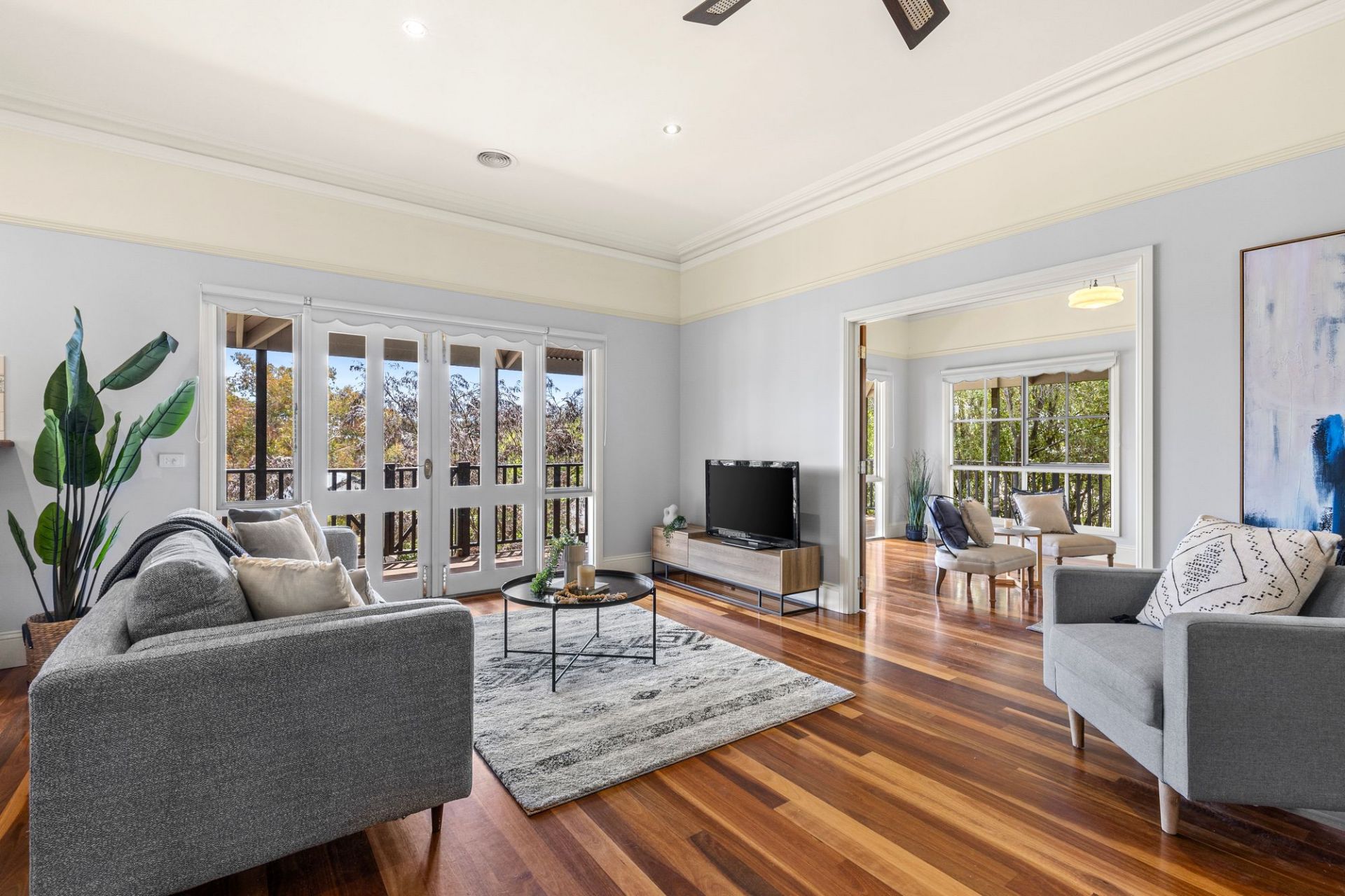 The master suite is a haven of neutral tones, boasting a walk-in robe and a heritage-style ensuite. Each additional bedroom mirrors the generous proportions of the master and boasts either garden vistas or veranda access. A third living space is adjoined by three of the five bedrooms and includes built-in storage. Gleaming hardwood floors throughout and plush carpet in the bedrooms feel warm underfoot, and ducted heating and reverse-cycle air conditioning in each of the bedrooms ensures year-round comfort.
