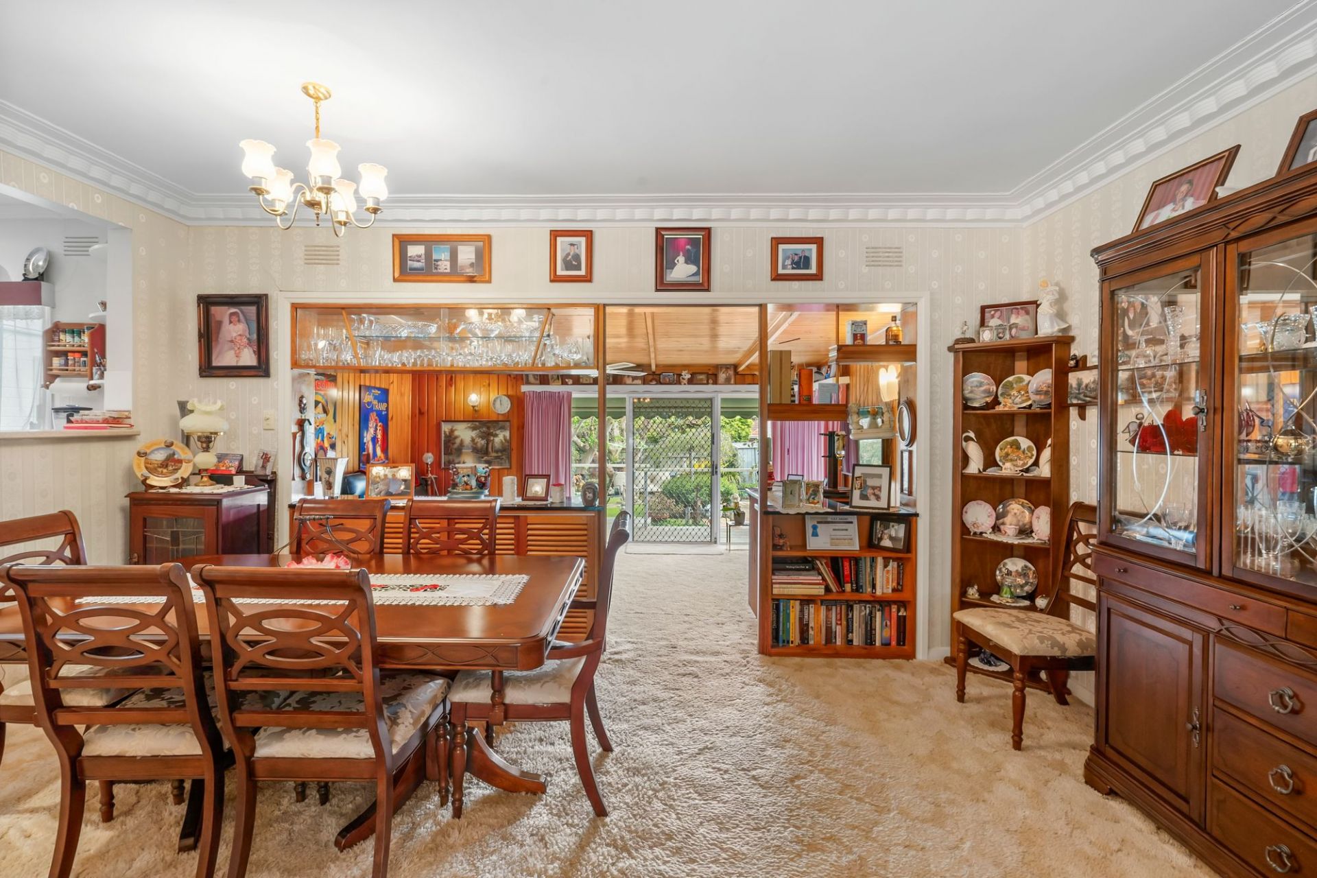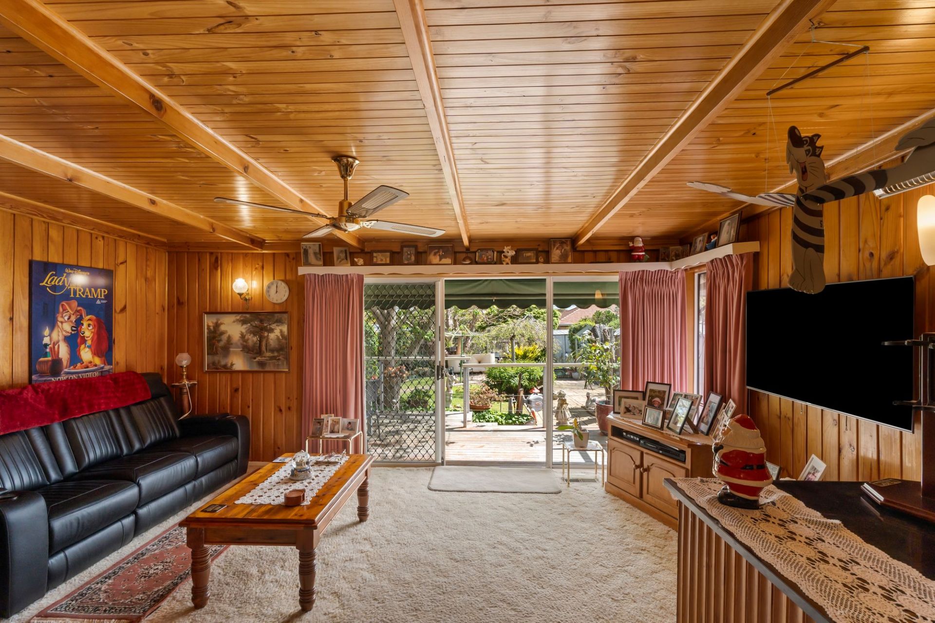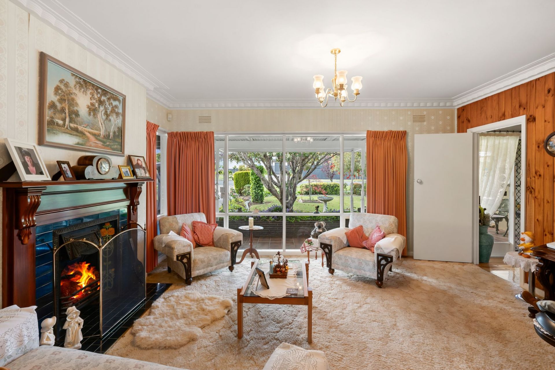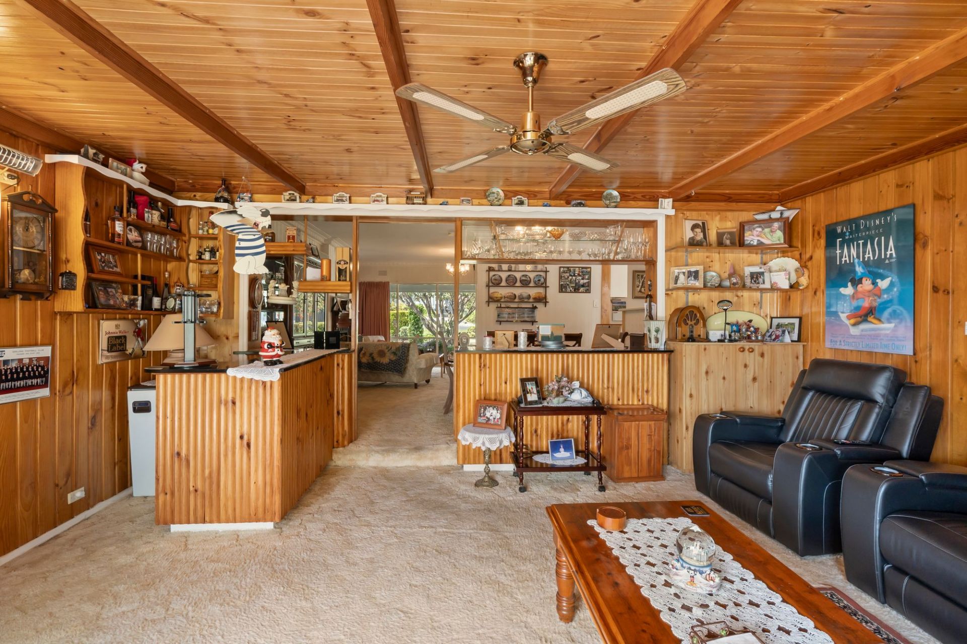 Inside, the home radiates warmth and personality. The linear layout unfolds to a welcoming living and dining zone where pine-lined walls and ceilings, ornate light fittings and period details capture the spirit of the era. An ornamental fireplace anchors the space with cosy ambiance, while ducted heating, ceiling fans and reverse cycle air conditioning ensure year-round comfort. The built-in cocktail bar adds a playful nod to mid-century entertaining, while sliding doors open to both front and rear elevations, connecting effortlessly with the outdoors.