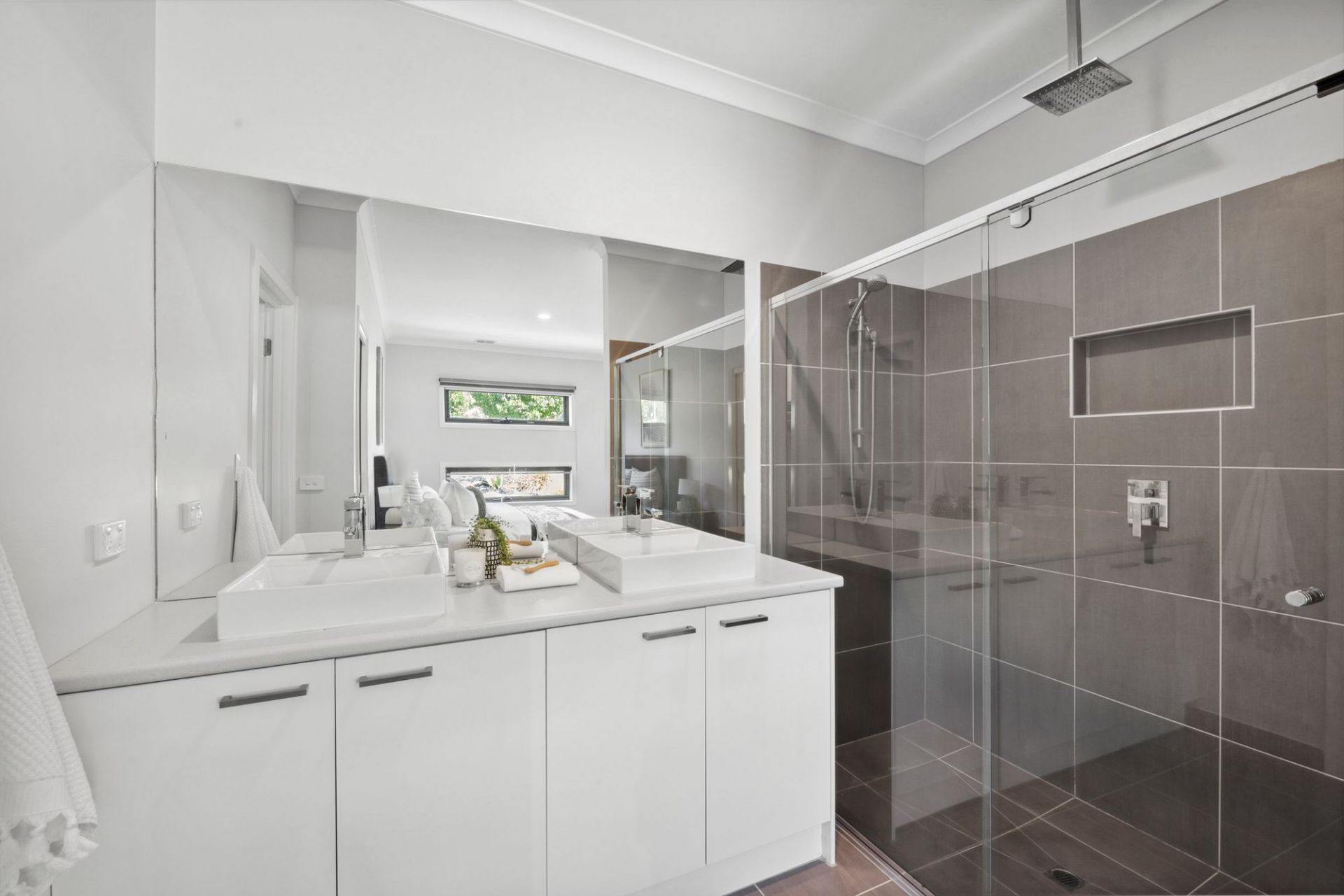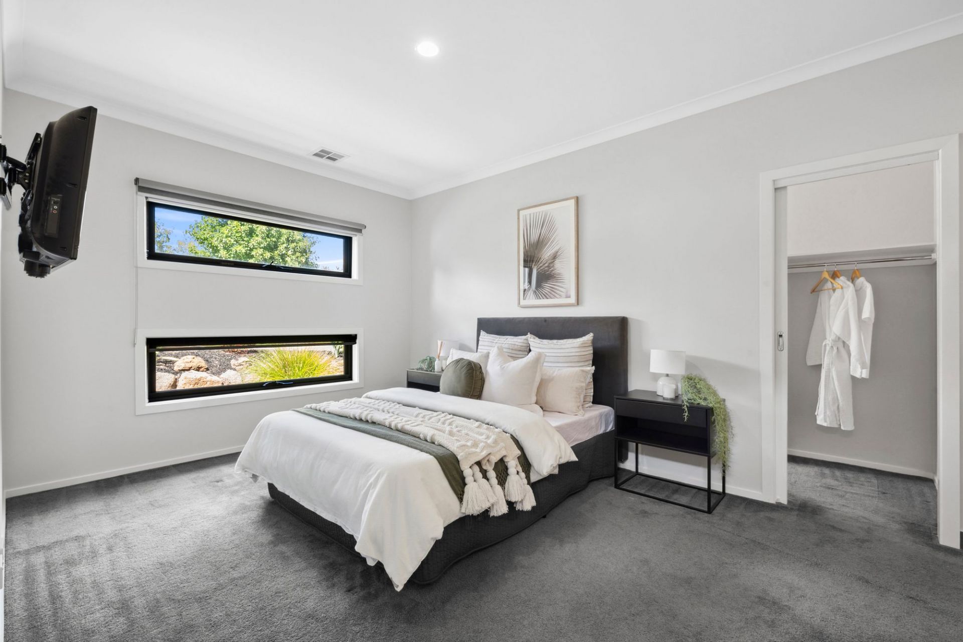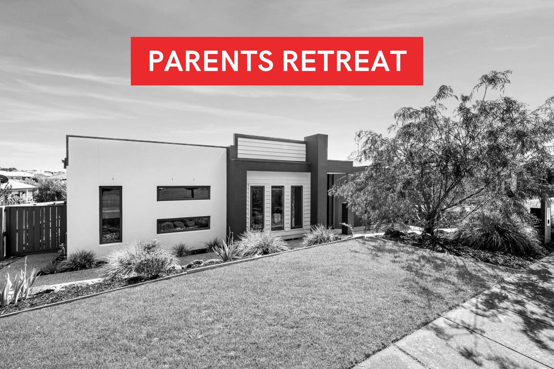 The master bedroom is a serene sanctuary, boasting a king-size layout, plush carpet, and a luxurious ensuite with an extra-wide fully tiled shower recess and double vanity. Two additional queen-sized bedrooms, each with mirrored built-in robes and serviced by a family bathroom with separate toilet provide comfortable accommodation for the family. Also includes a second lounge area as well as a flexible parents' retreat offering versatility as an office space or nursery.