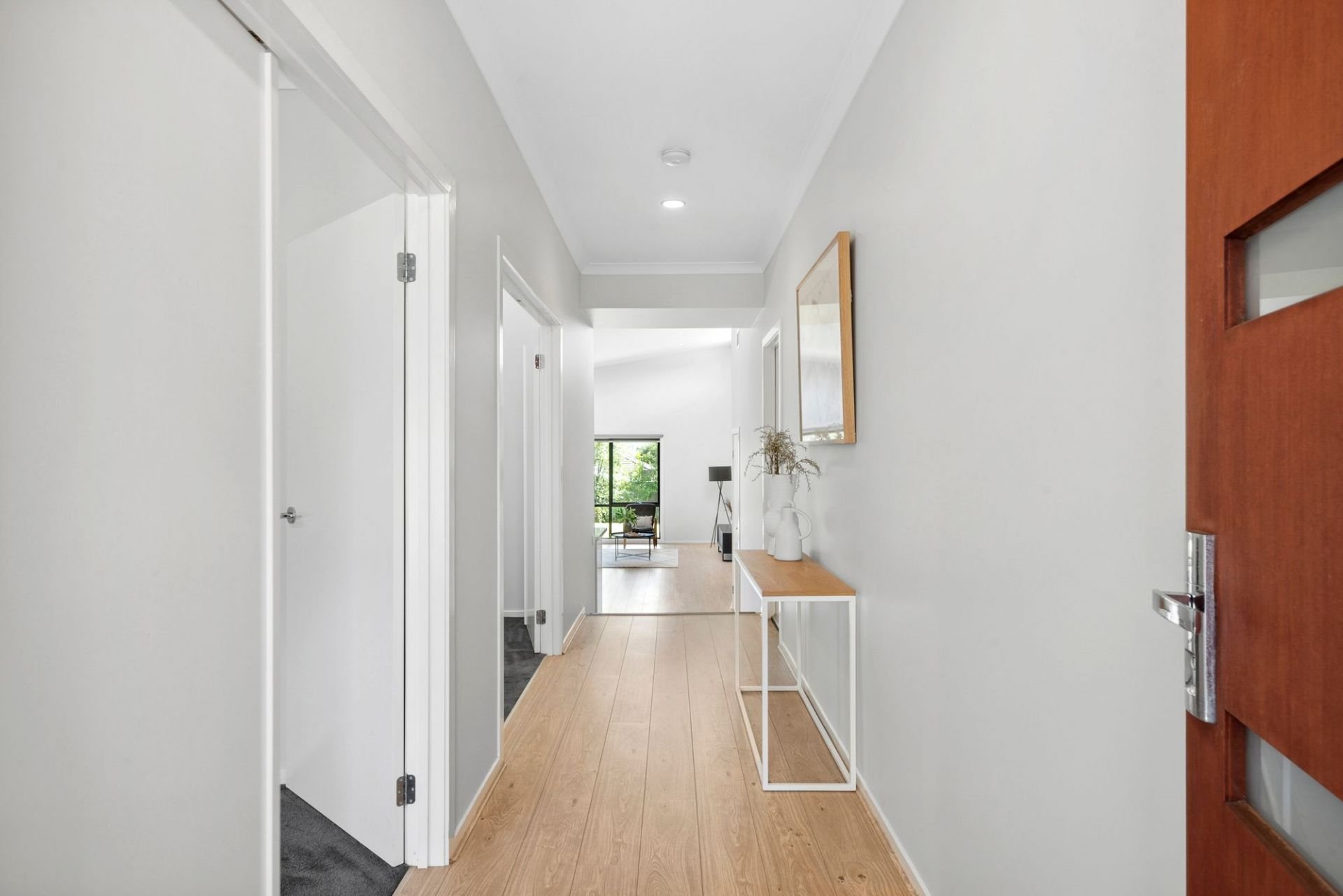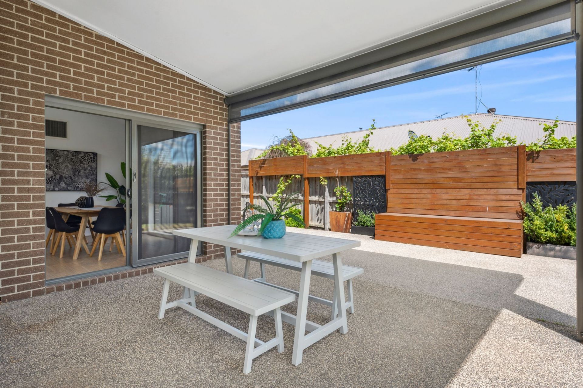 Outside, the covered alfresco area is the perfect spot for outdoor entertaining, with exposed aggregate concrete paving and cafe blinds for added comfort. The low-maintenance backyard, complete with lush lawn and perimeter planting, offers plenty of space for children to play and pets to roam.