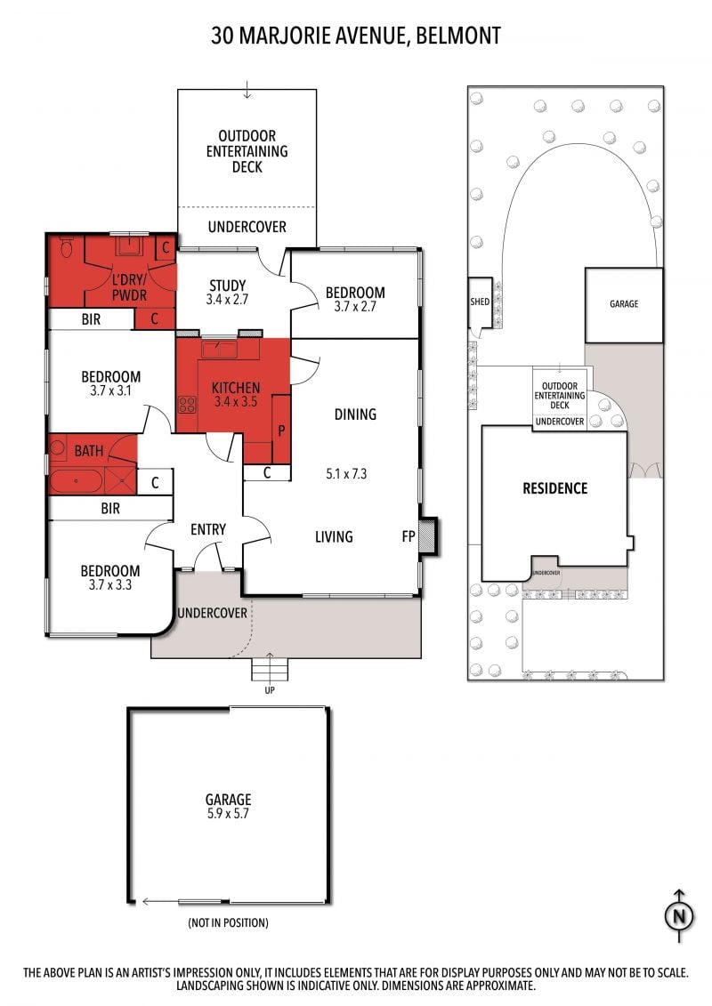 Three bedrooms (2 with built-in robes) are serviced by a central bathroom with bath, shower and vanity, with a powder room located beyond the laundry. Set on a generous 653sqm (approx) with fully fenced grounds and double gates to the garage and studio/workshop space at rear, this property offers plenty of secure parking, with the practicality of a garden shed for all the tools.
