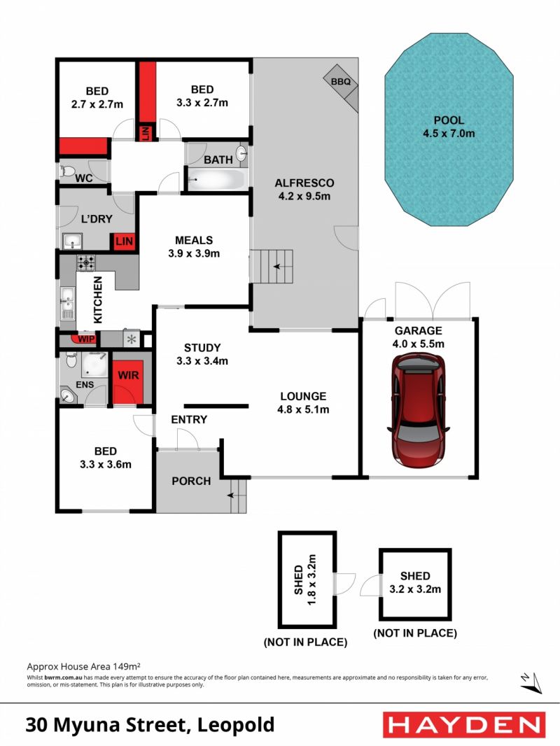 This family home is located within a short walk to Ash Road shopping strip, public transport, Myuna Reserve playground and a short drive to Gateway plaza, sporting grounds, Leopold Primary school and Community Centre. Featuring a large lounge and study at the front of the property, family kitchen complete with gas cook top, oven, dishwasher, pantry, and dining room which opens onto the undercover alfresco area, perfect for summer entertaining. Master bedroom with walk in robe and ensuite, a further two bedrooms with built in robes, family bathroom with shower over bath, separate toilet and laundry. Single car lockable carport, garden shed and swimming pool complete this family home. Wood fire and split system heating and cooling and ceiling fans for year round comfort.