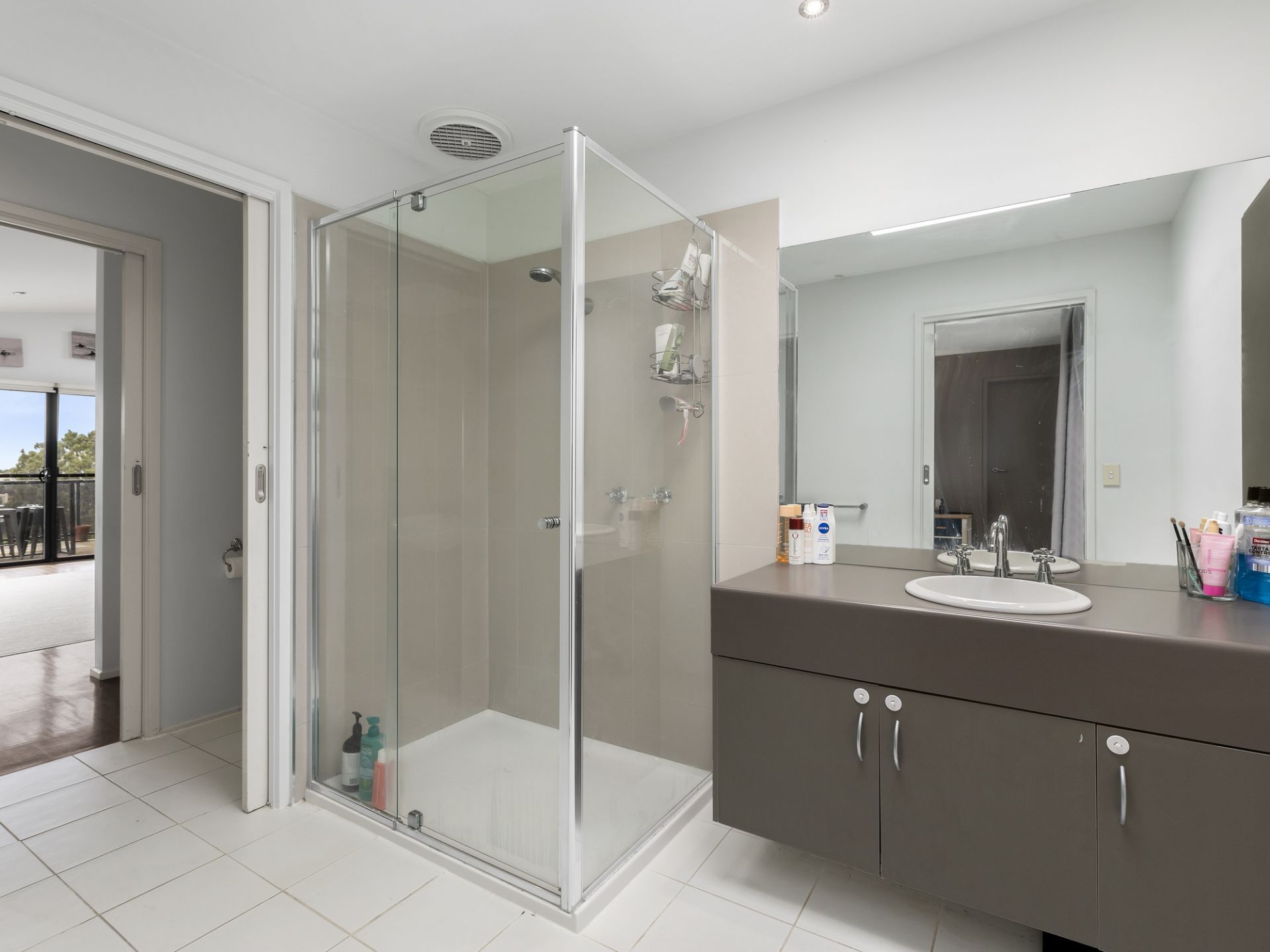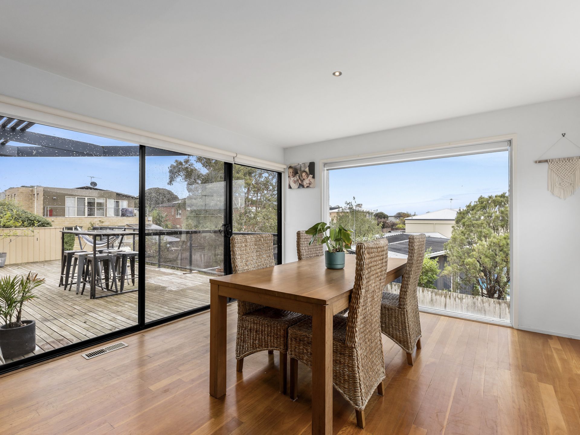 The sleek kitchen boasts expansive stone benchtops and ample storage, harmoniously connecting the dining and family areas. Floor-to-ceiling glazing and triple-stacker doors frame serene treetop views, blending indoors and out. The outdoor deck, with its convenient external staircase, serves as a third entertaining space—ideal for lazy afternoons, sunny breakfasts, or year-round alfresco dining.