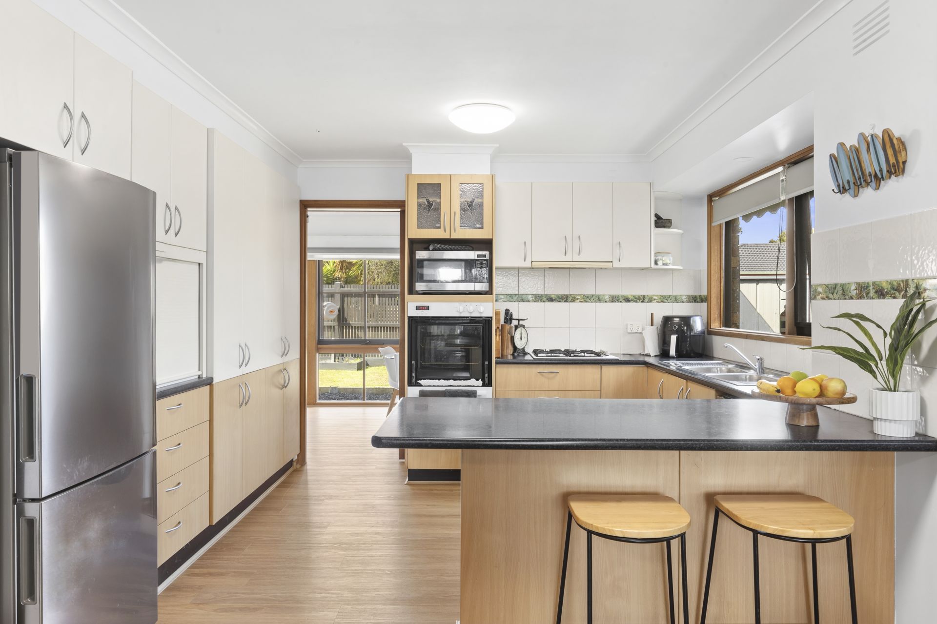 The interior unfolds across a highly functional single level layout, offering generous living zones that allow families to gather or retreat with ease. Light-filled living and dining spaces connect seamlessly to the heart of the home, a well-appointed kitchen designed for both everyday use and entertaining, with excellent storage, quality appliances and clear sightlines to indoor and outdoor living areas. Timber floors, soft neutral finishes and abundant glazing enhance the sense of warmth and openness throughout.