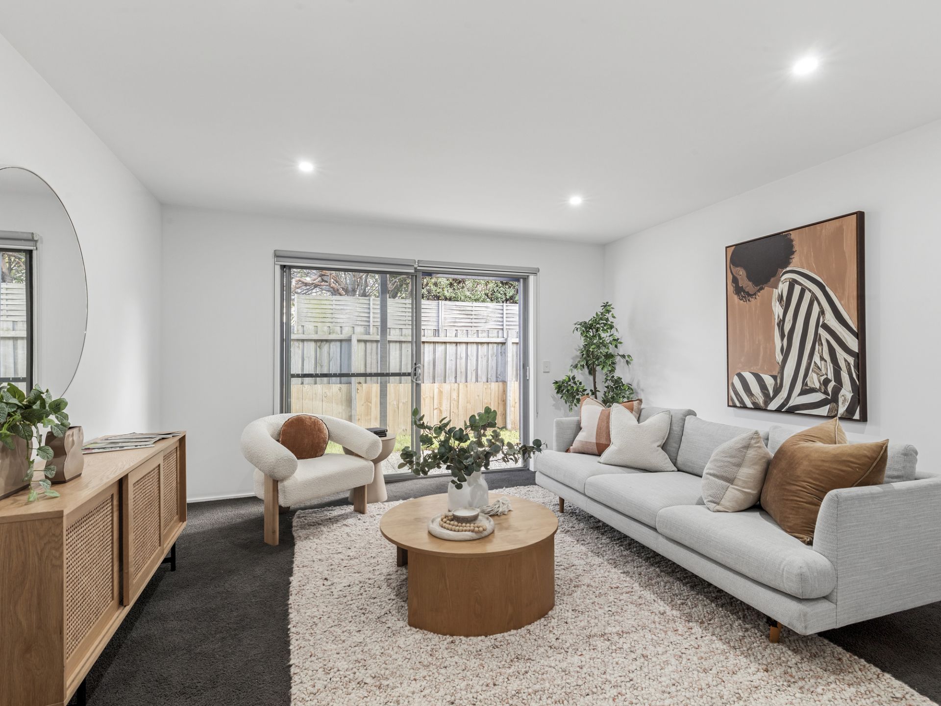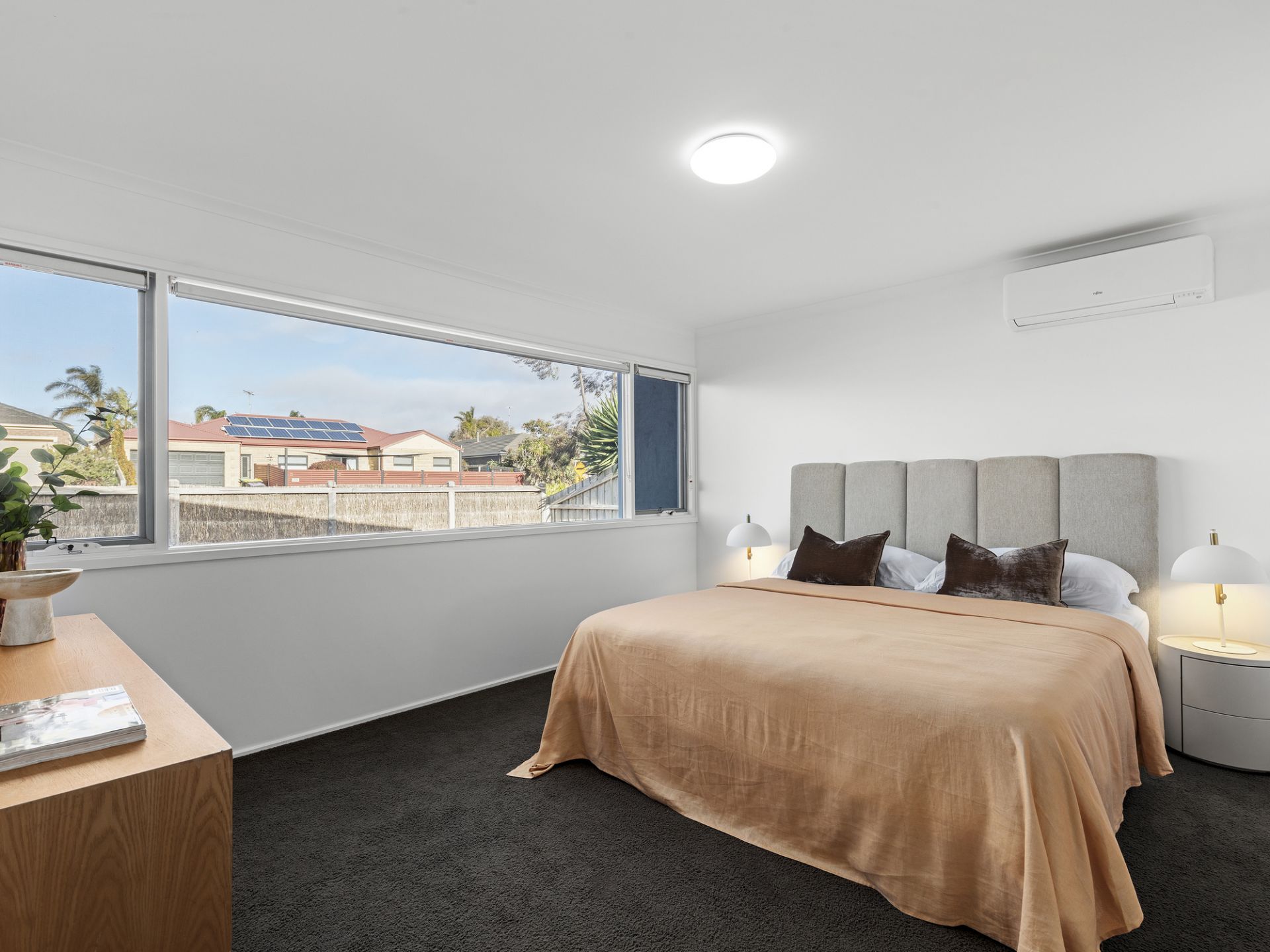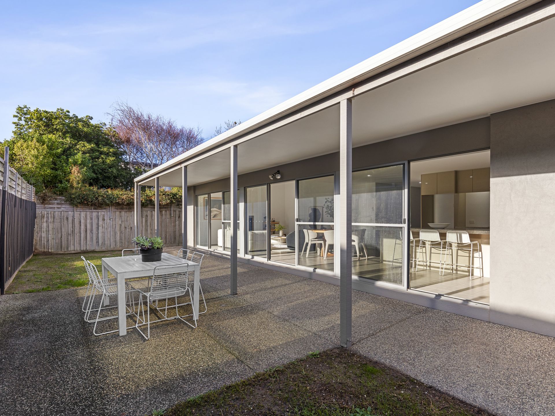 Flowing effortlessly from the kitchen, the dining area connects to the inviting main living space, highlighted by a cozy gas log fire elegantly centred on the primary feature wall. The living areas truly embrace indoor/outdoor living, with three sets of glass sliders opening fully to the alfresco back patio.