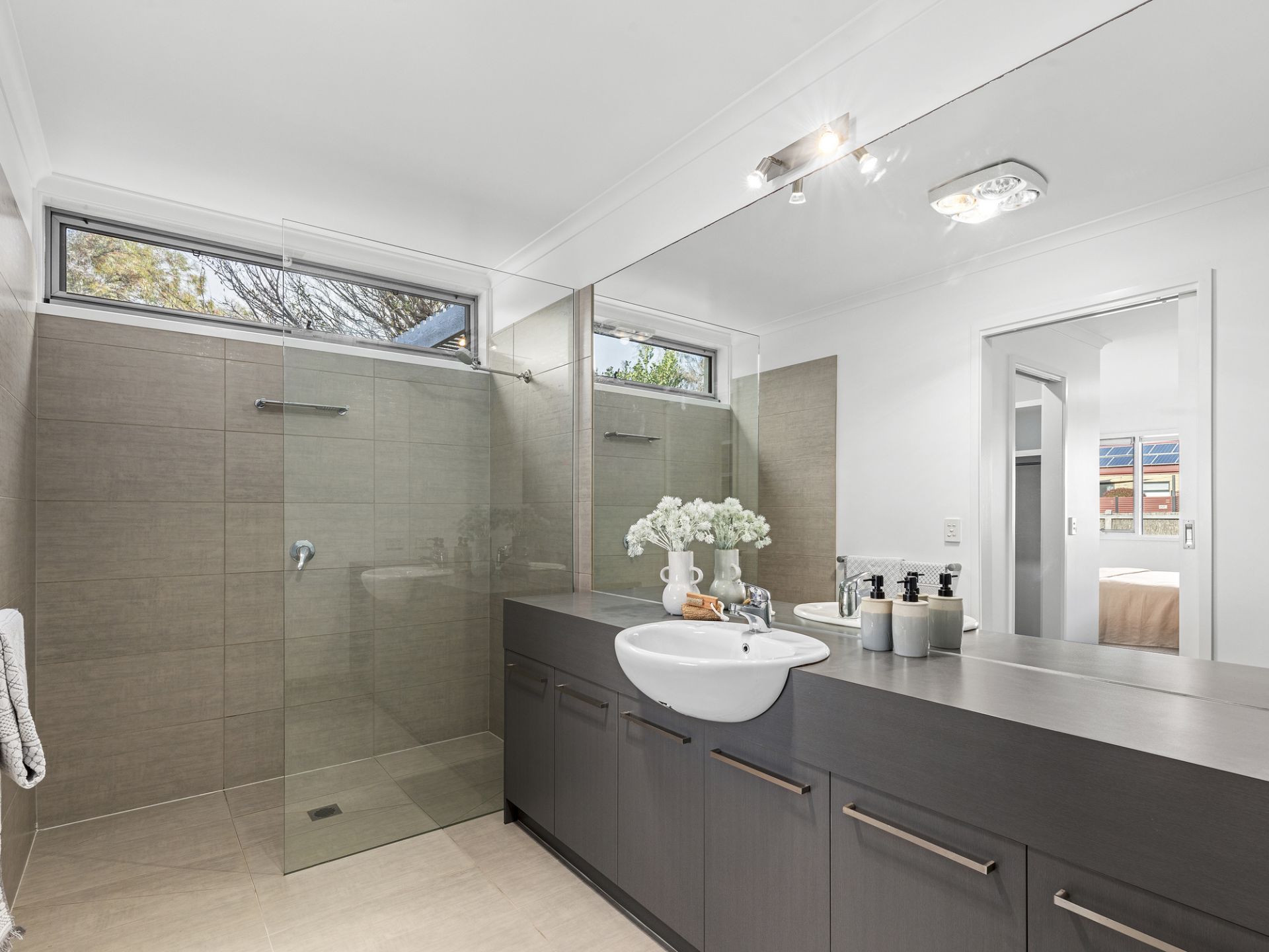 The home thoughtfully provides four versatile bedrooms, with the fourth offering the flexibility to be utilized as a second living area, adapting to your family's needs. Two of the spacious bedrooms conveniently share a central bathroom, featuring an open basin area and separate rooms for the toilet and shower. The luxurious main bedroom is a true retreat, boasting his-and-hers walk-in robes that lead into a generously sized ensuite.