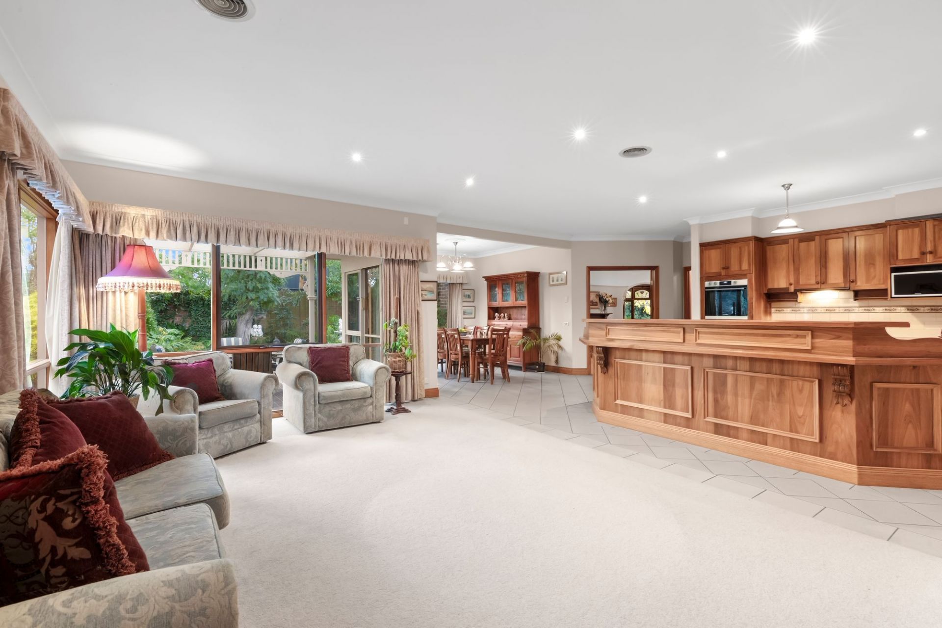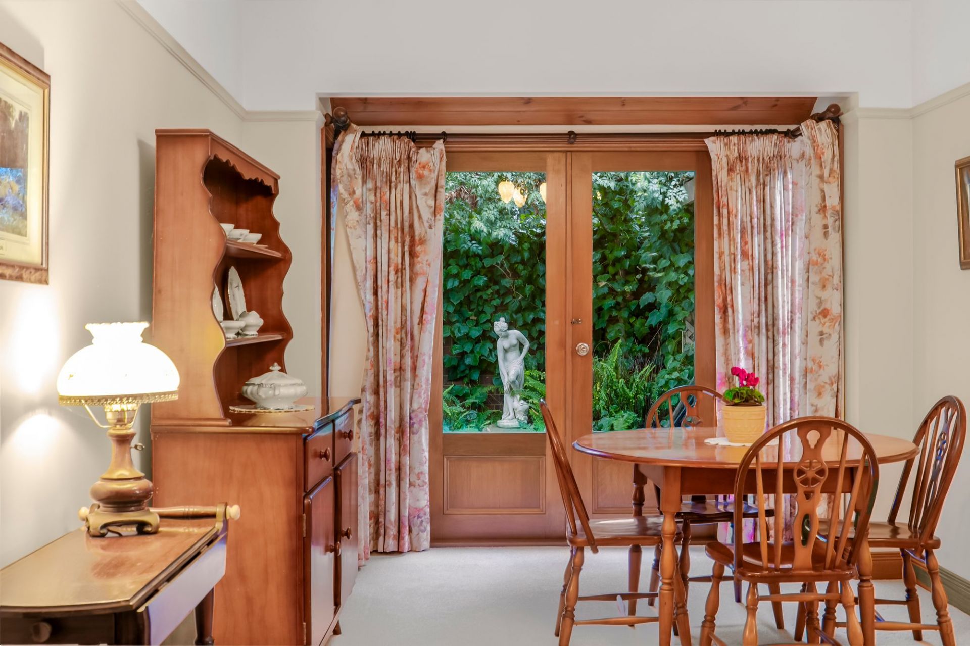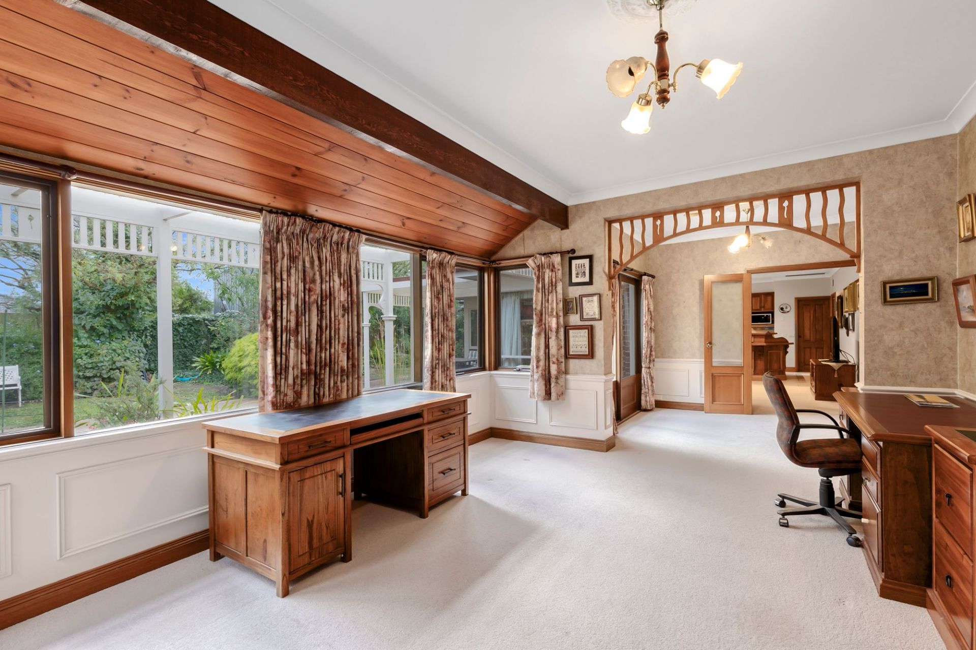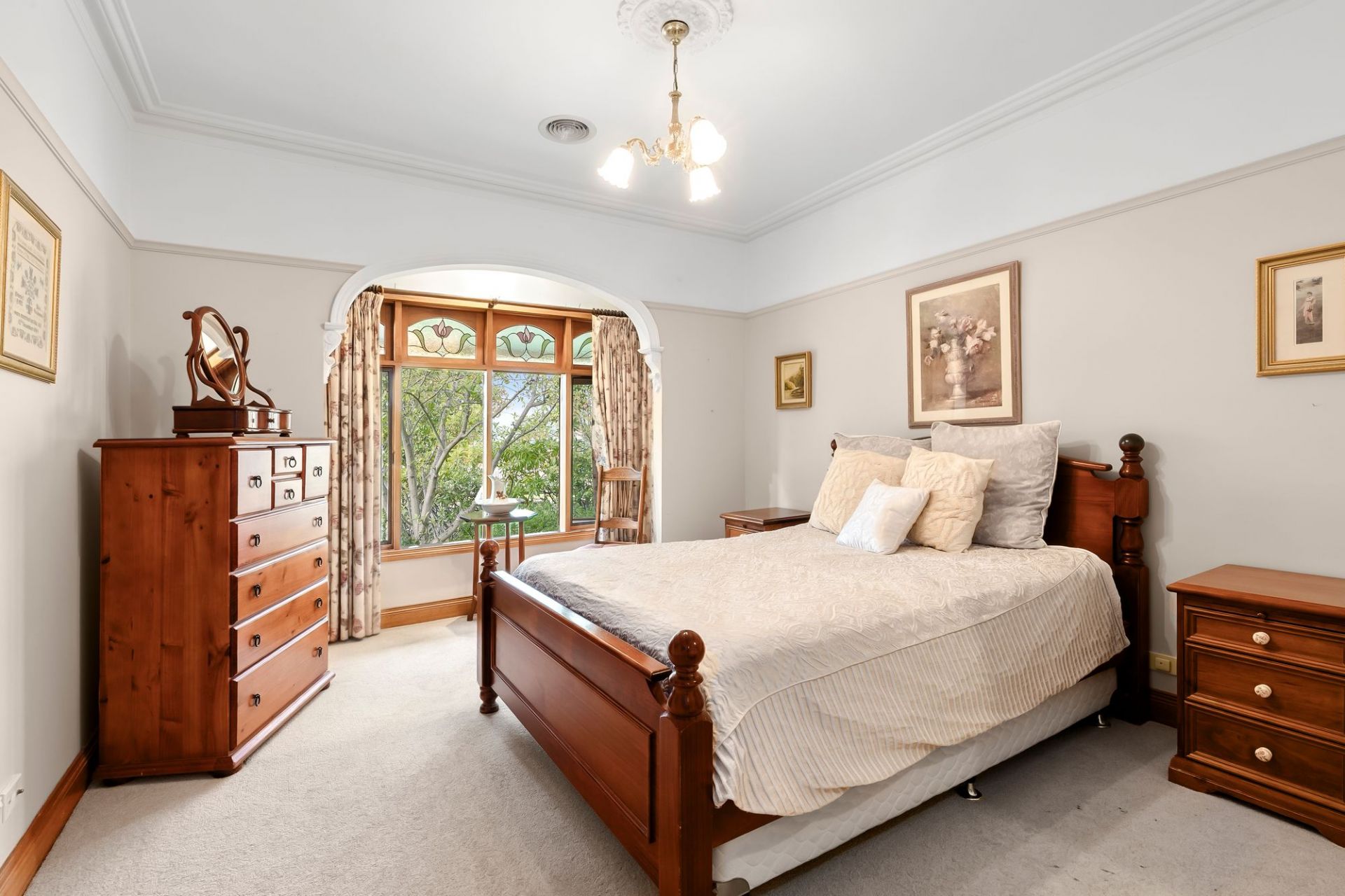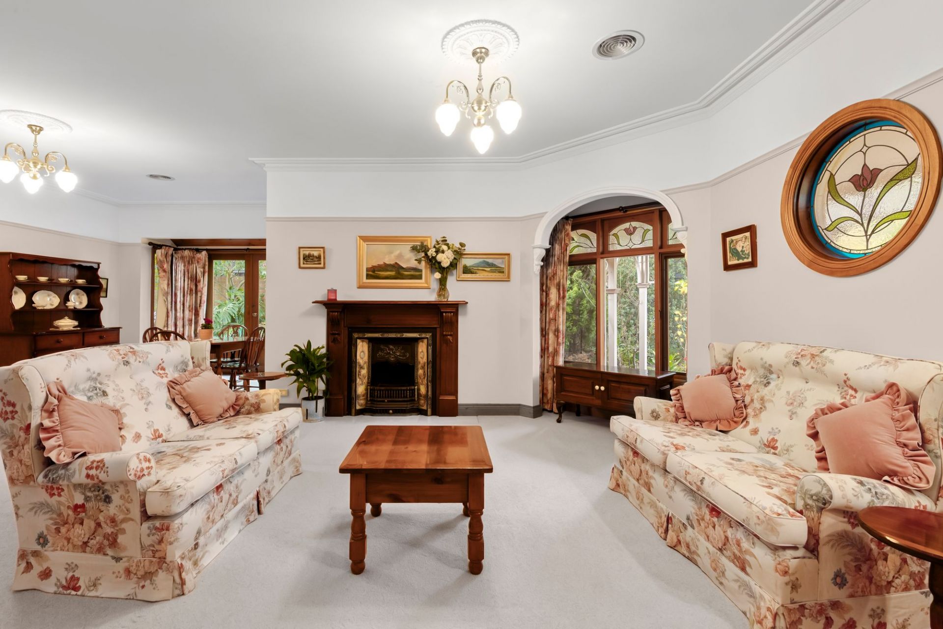 Traditional charm invites you towards lovely established gardens and deep set verandas on arrival, instantly evoking a sense of old-world charm and remarkable integrity. Hardwood-stained glass windows are framed by elegant arcs, softened by lush carpets underfoot and the ambiance of a wood fire within the formal lounge and dining area to the front of the home. An adjacent sunny north facing patio is privatised by established trees and gardens, linking you to the expansive manicured grounds that envelope the homes entirety.