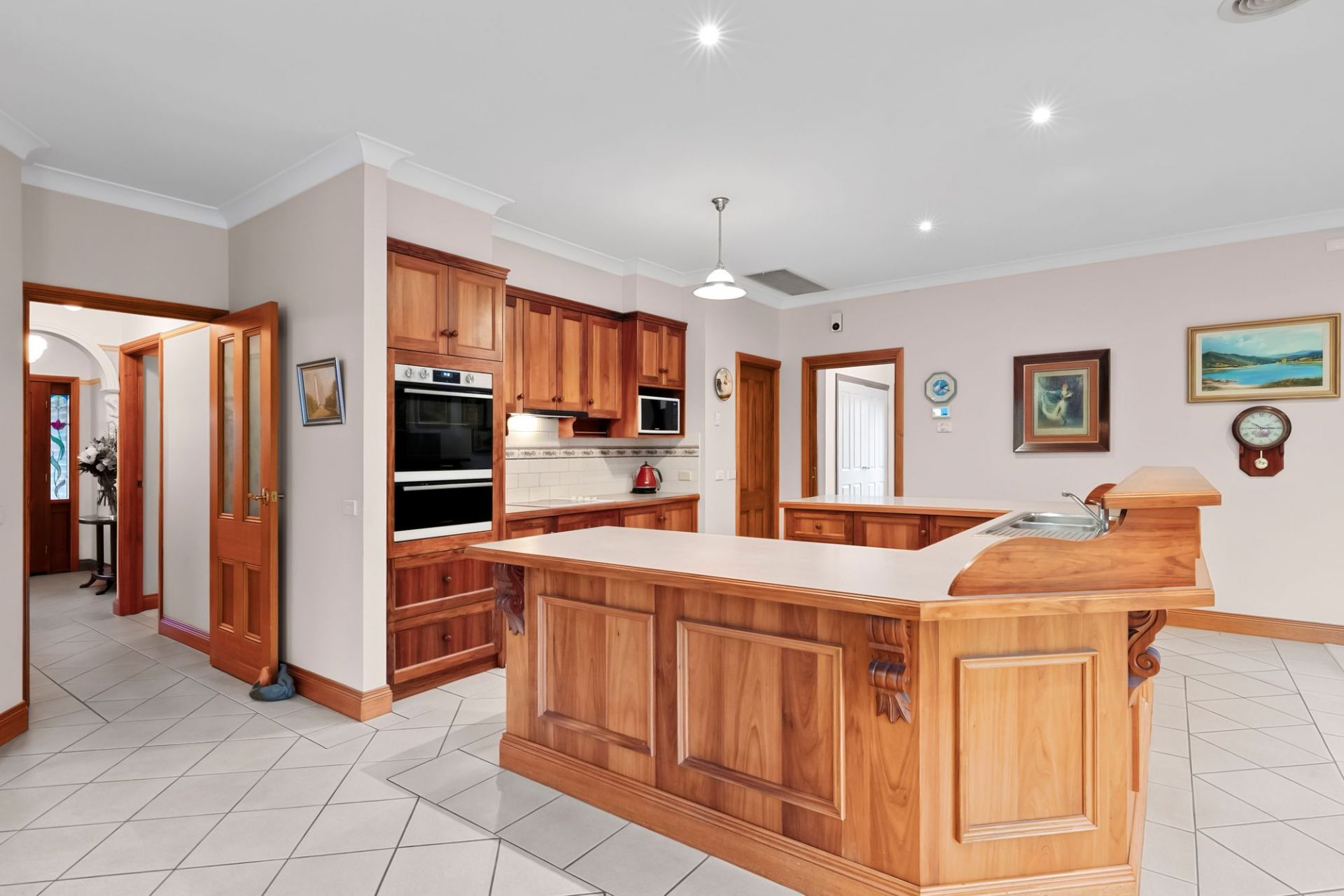 A central kitchen, living and dining zone features wraparound hardwood glazing and connection to sun infused gardens via timber sliding doors, naturally inviting family and friends to gather and celebrate the expanse of space and sense of home unveiled here. Connoisseurs will flourish in the wonderfully equipped gourmet kitchen, showcasing solid Blackbutt timber cabinetry, quality appliances and a well-appointed walk-in pantry.