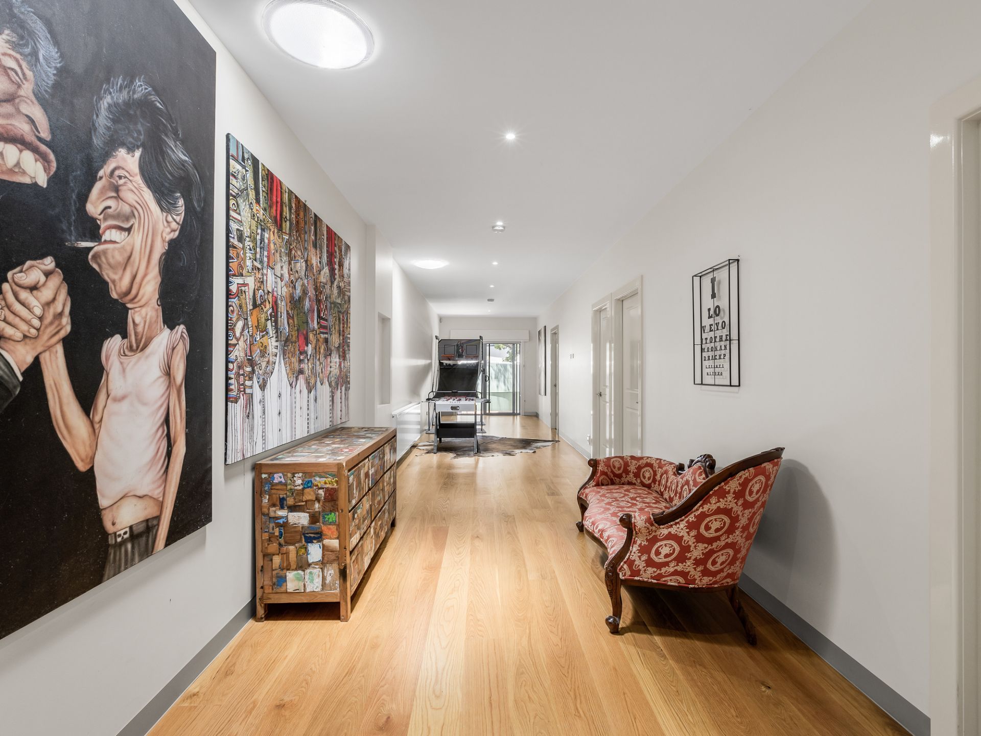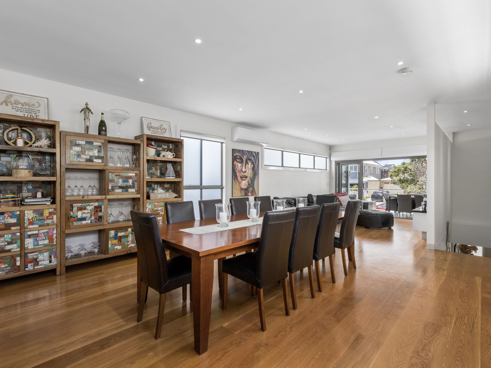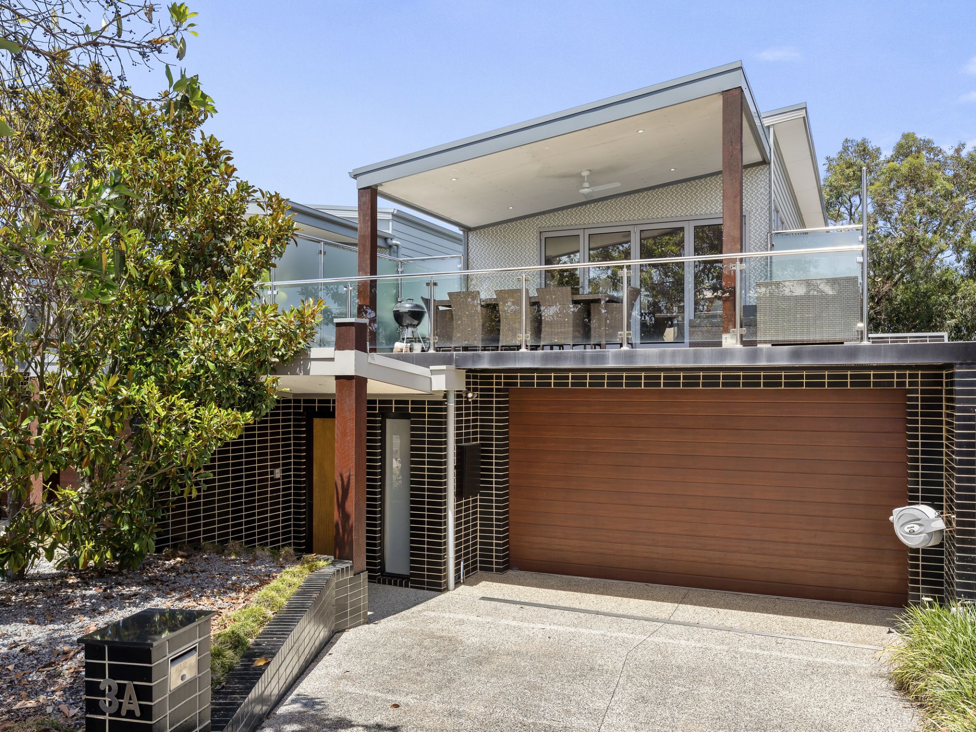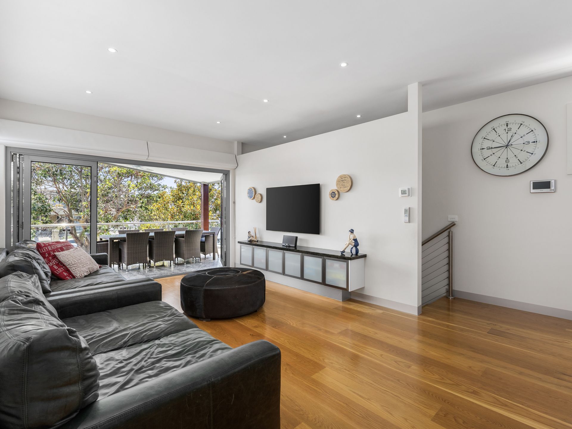 Downstairs, you'll find stunning hardwood floors complemented by warm feature wood panelling and a fresh beach-inspired aesthetic. Three spacious bedrooms, all with built-in robes and individual split-system cooling, provide comfortable retreats for family or guests. The family bathroom features luxurious full-height glazing, while a separate powder room adds extra convenience. A versatile living space on this level is perfect as a teenage retreat or kids' playroom, flowing effortlessly into a neat, low-maintenance turfed backyard with a sundeck. The double garage, with sparkling epoxy flooring, ensures both functionality and style, alongside ample off-street parking.