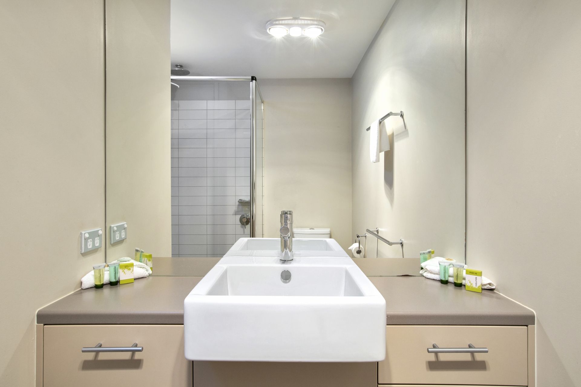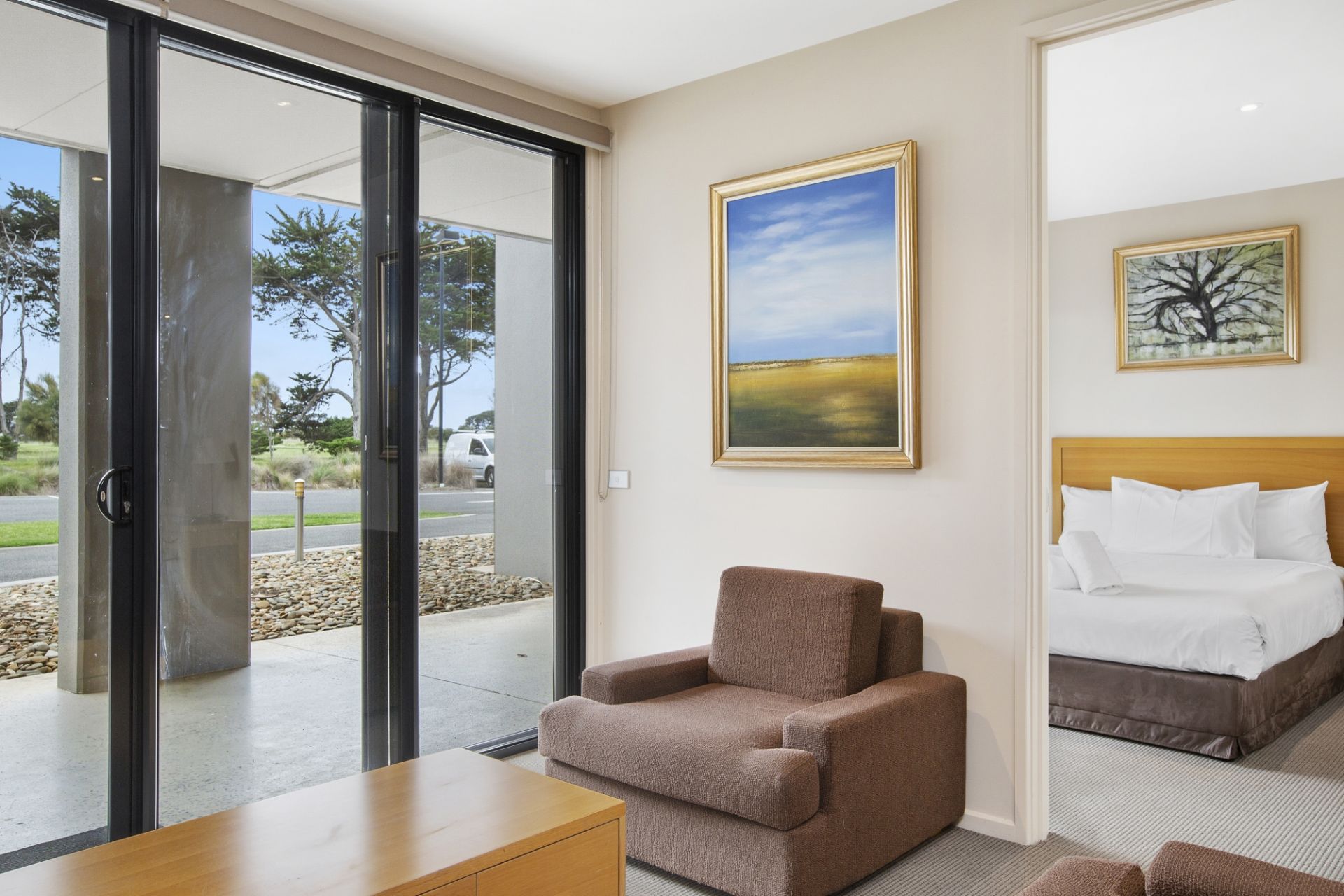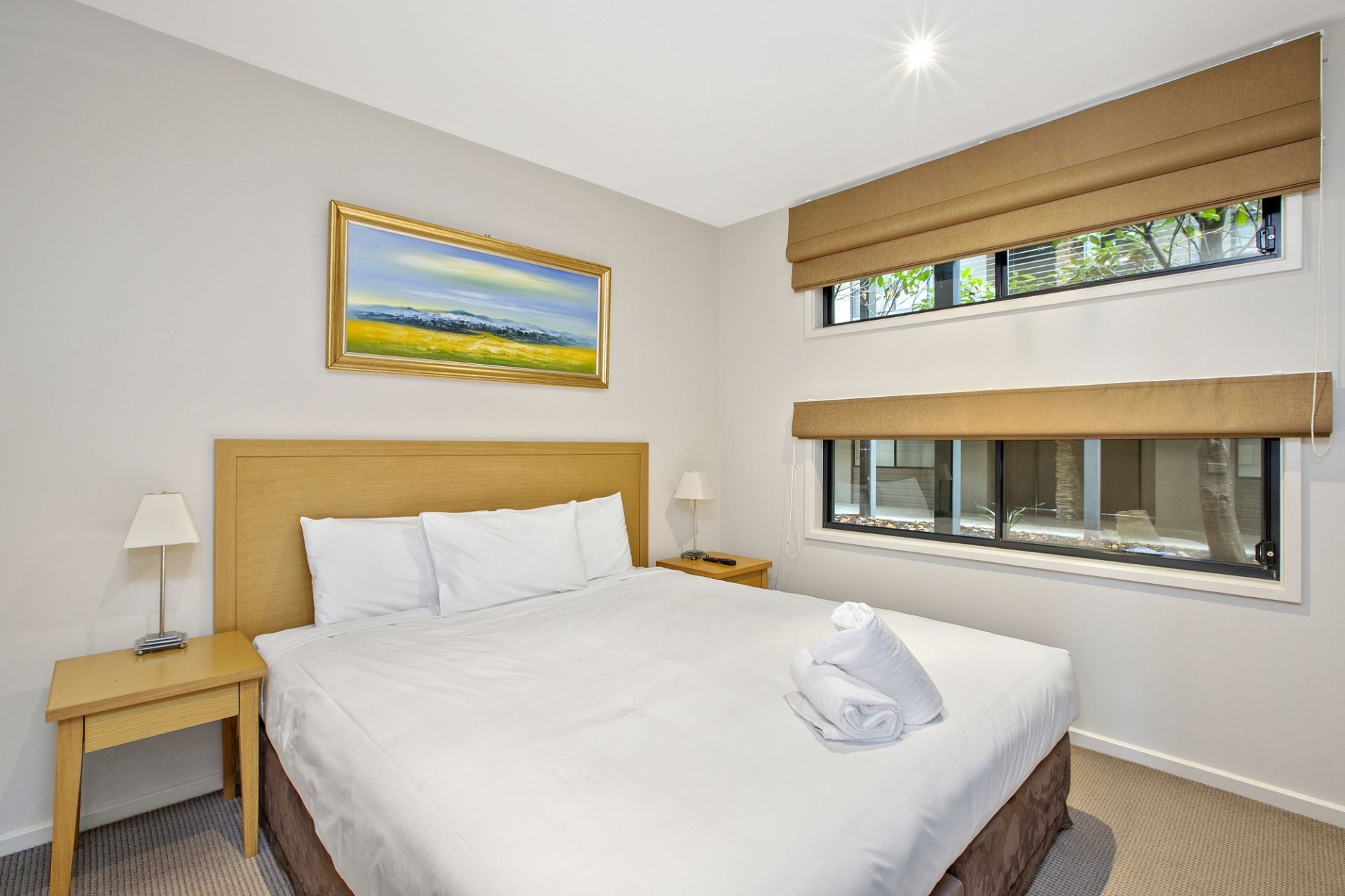 Either side of the modern bathroom is one bedroom with a king bed, TV and BIR, the other has a queen bed and BIR. A neutral palette throughout the suite. Featuring access to an outdoor swimming pool, gymnasium, tennis courts, day spa, restaurant, function rooms, conference centre and carpark.