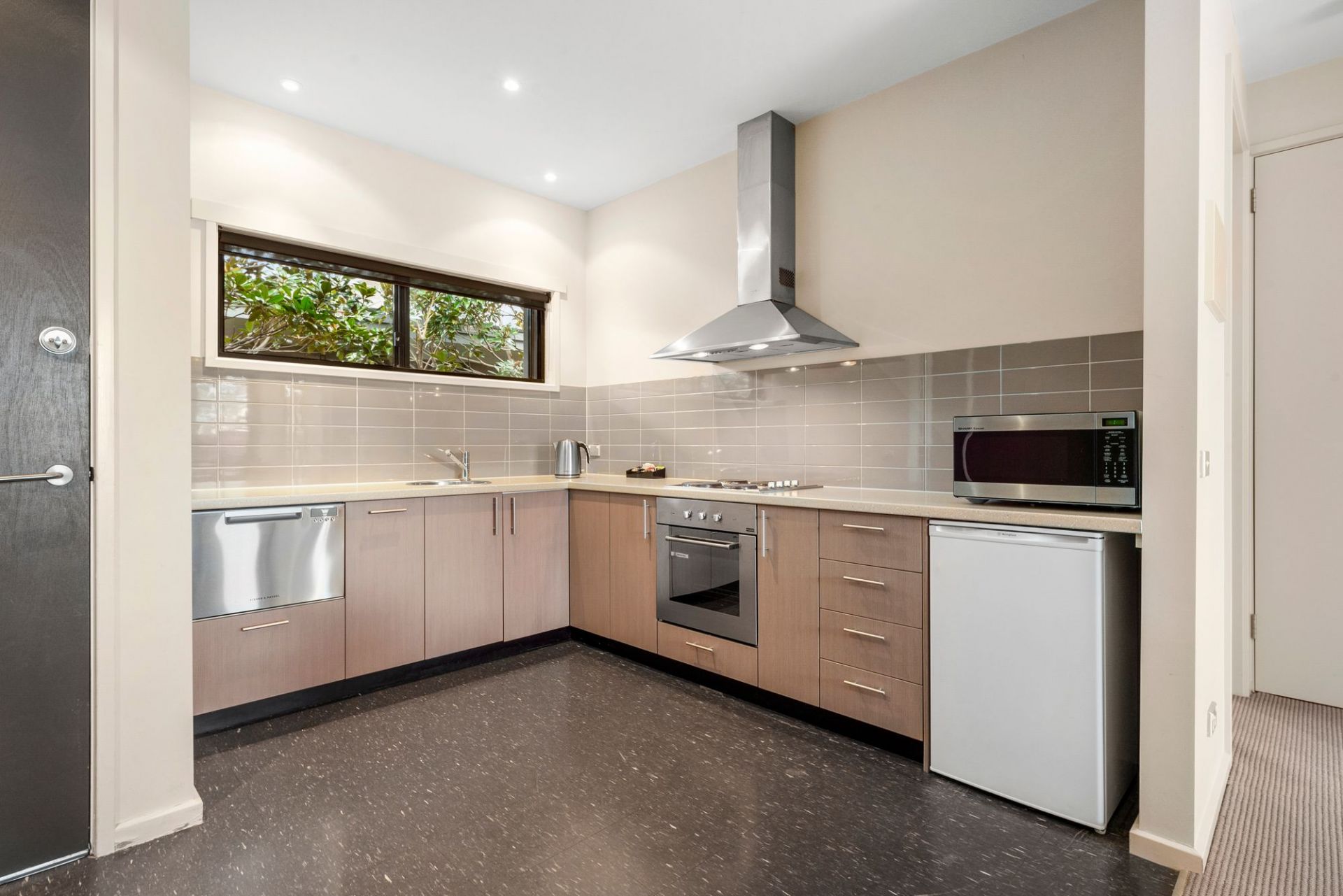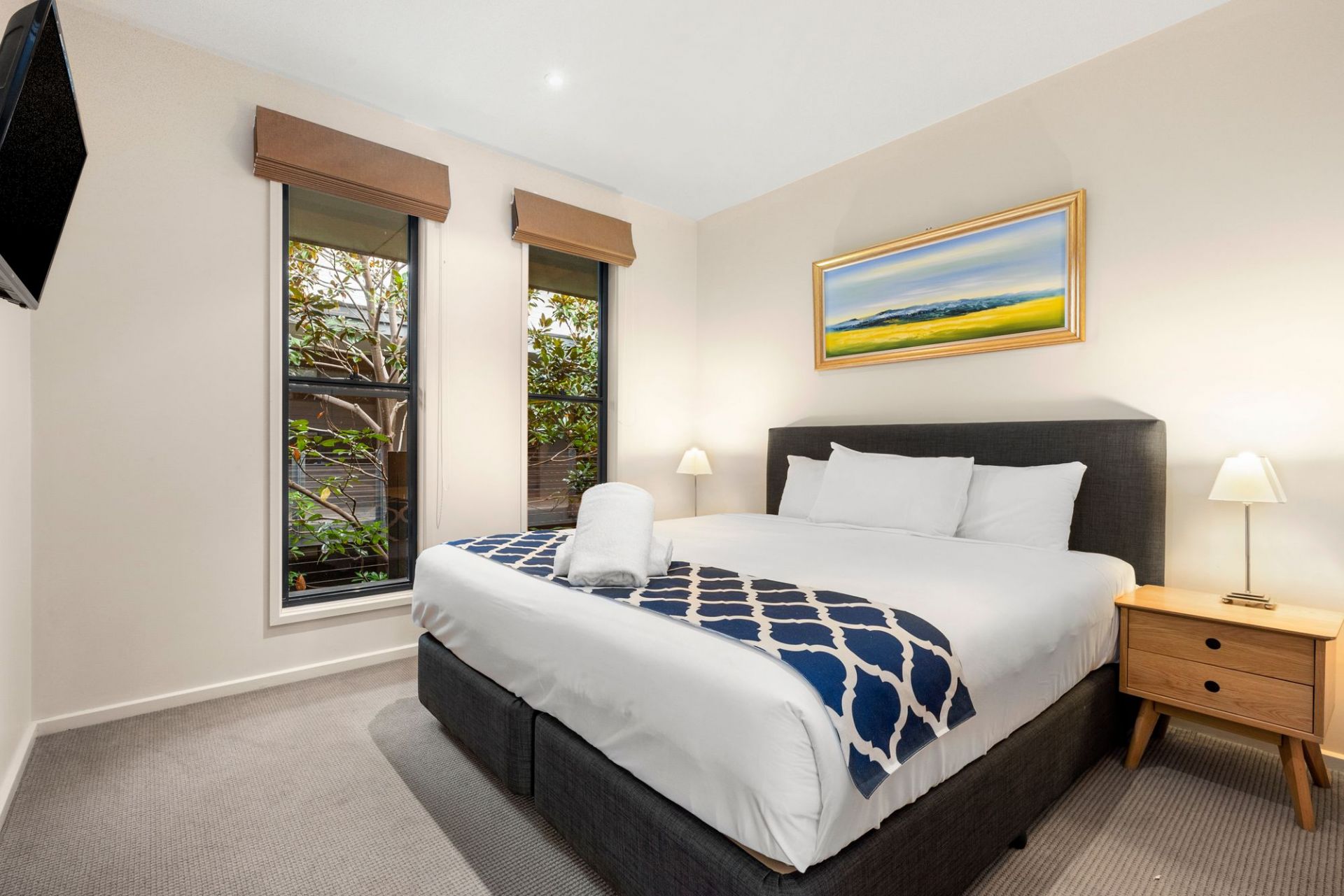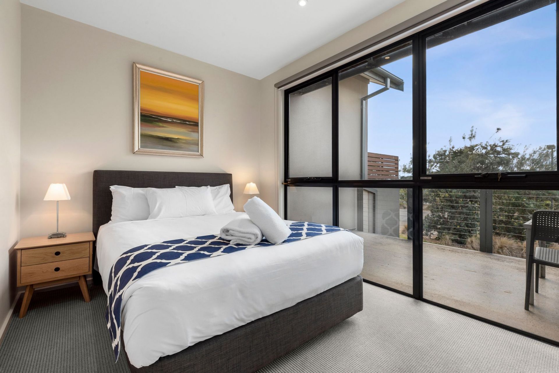 The apartment is decked out in neutral tones and simple, stylish furniture. The open plan kitchen - well-appointed with Franke appliances and ample cabinetry - combines with the living and dining area and the whole zone is flooded with natural light thanks to a full wall of glazing to the north. Sleeping quarters are both queen-sized; the master comes with a roomy built-in double robe. The larger-than-usual bathroom is a pleasant space fitted with shower, vanity with storage and WC and a broom cupboard provides additional storage. There's a communal laundry available and shared access to a BBQ area near the swimming pool. A Mitsubishi split-system air conditioner ensures comfort levels remain high year-round. The elevated vantage point from the private concreted undercover balcony is delightful.
