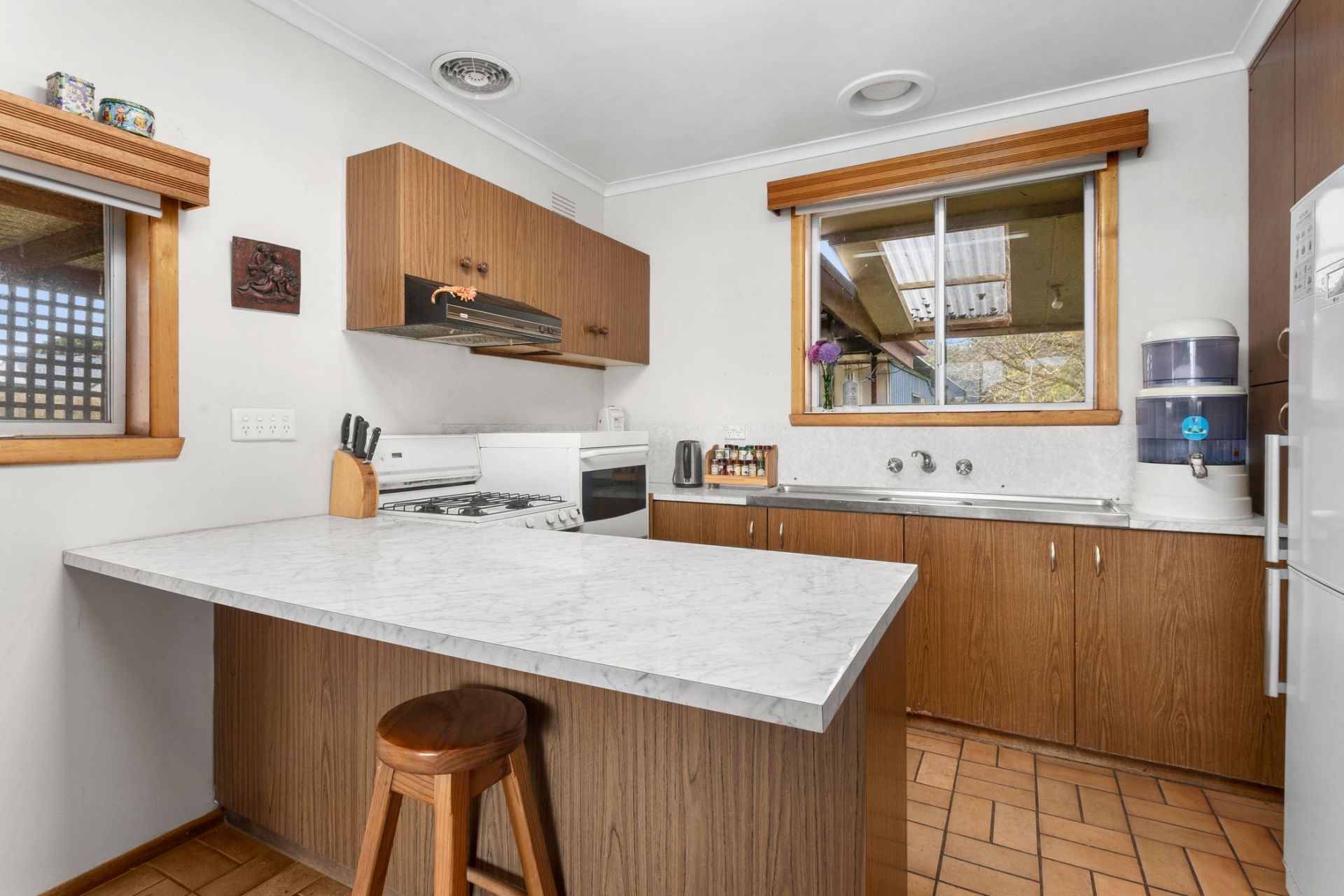 The home’s unique layout is designed for dual living, making this a perfect choice for those with family members who enjoy their independence. Raked timber ceilings and exposed brick walls add character to the interiors. The generous living room welcomes you inside and flows into the kitchen, which features a built-in pantry and cooking appliances (oven, gas cooktop, rangehood). Two bedrooms with built-in robes share close access to the bathroom, while the laundry and separate toilet complete the main home.