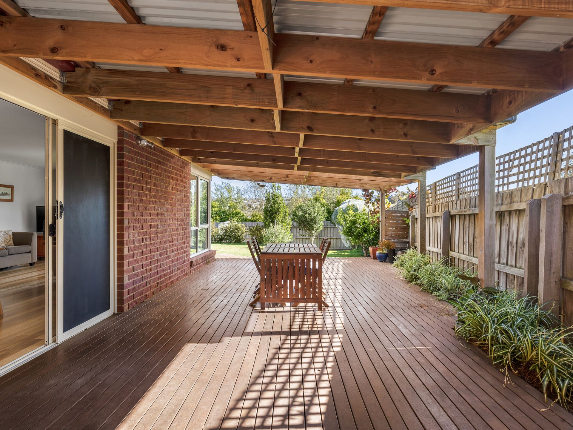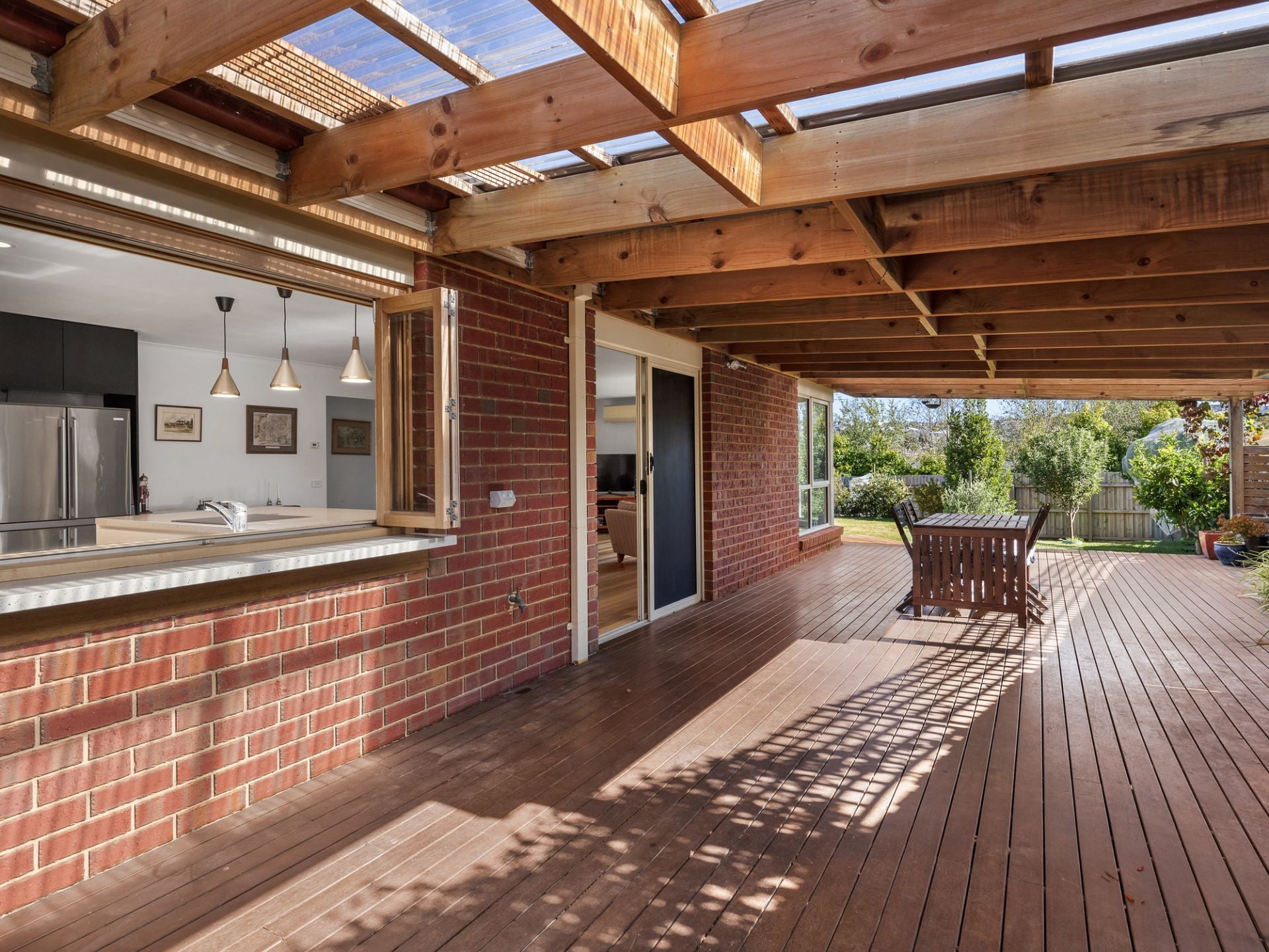 • Entertaining Area: A large covered alfresco area with a through bench from the kitchen offers seamless indoor-outdoor living, making it ideal for entertaining guests. The laser light above the deck was replaced just three years ago.