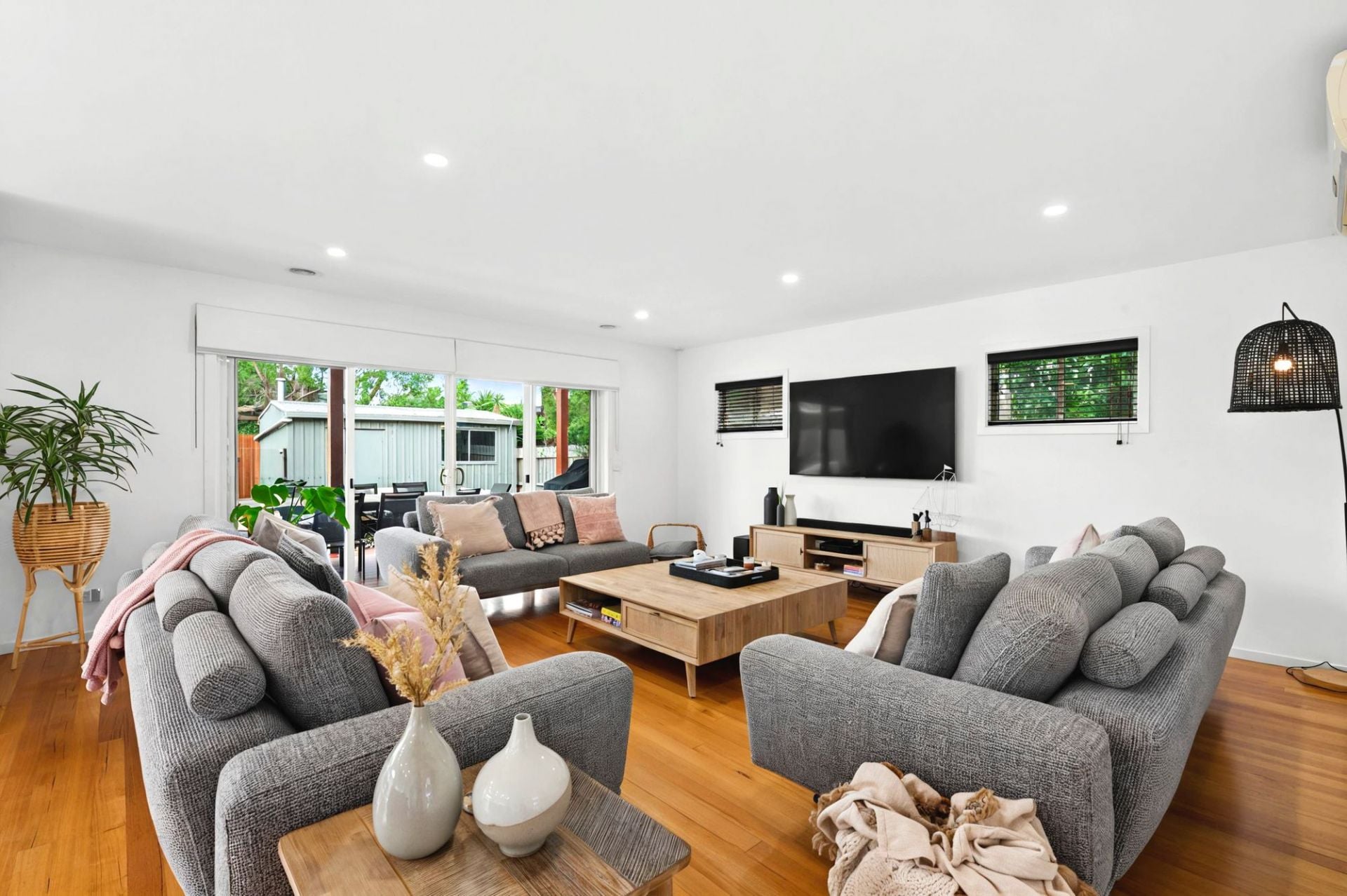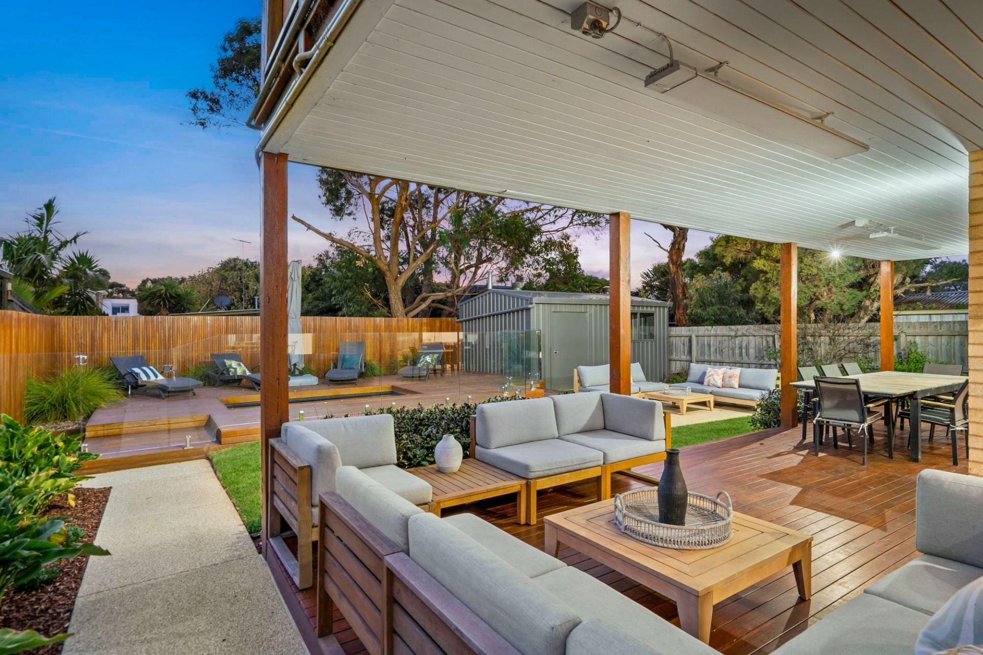 For parking, there is a double garage with internal access, and a rear roller door to the backyard with room for a caravan or boat through gates at the front. A rear garden shed provides extra storage.