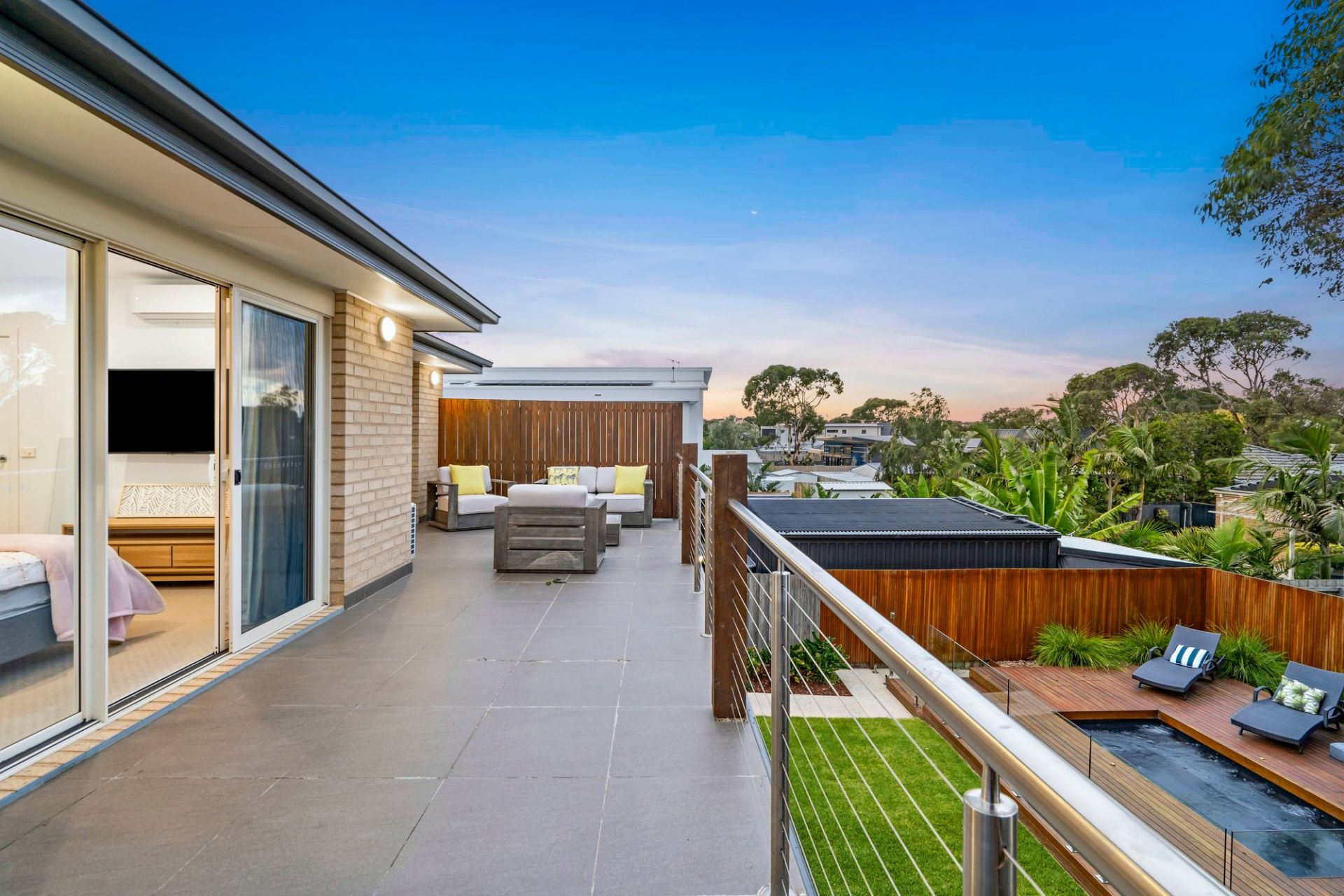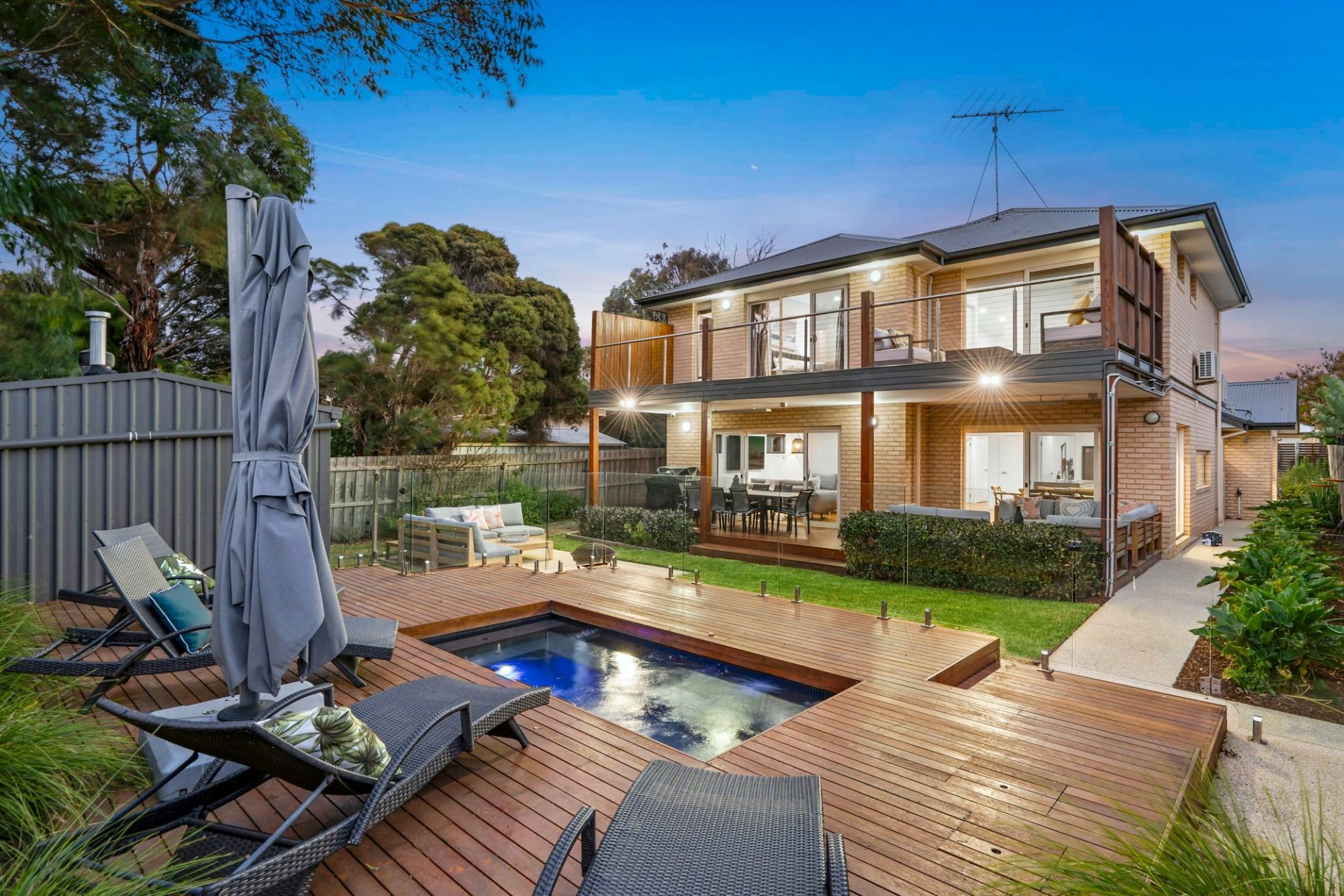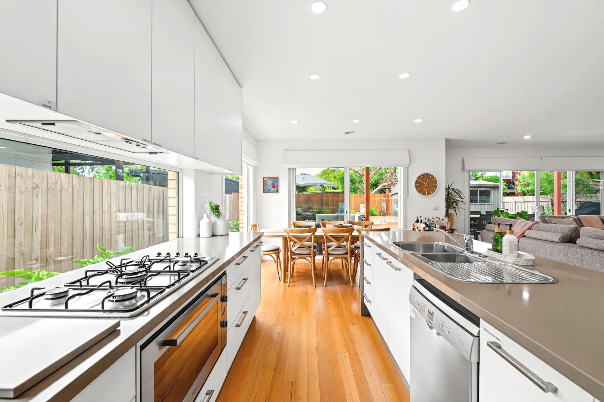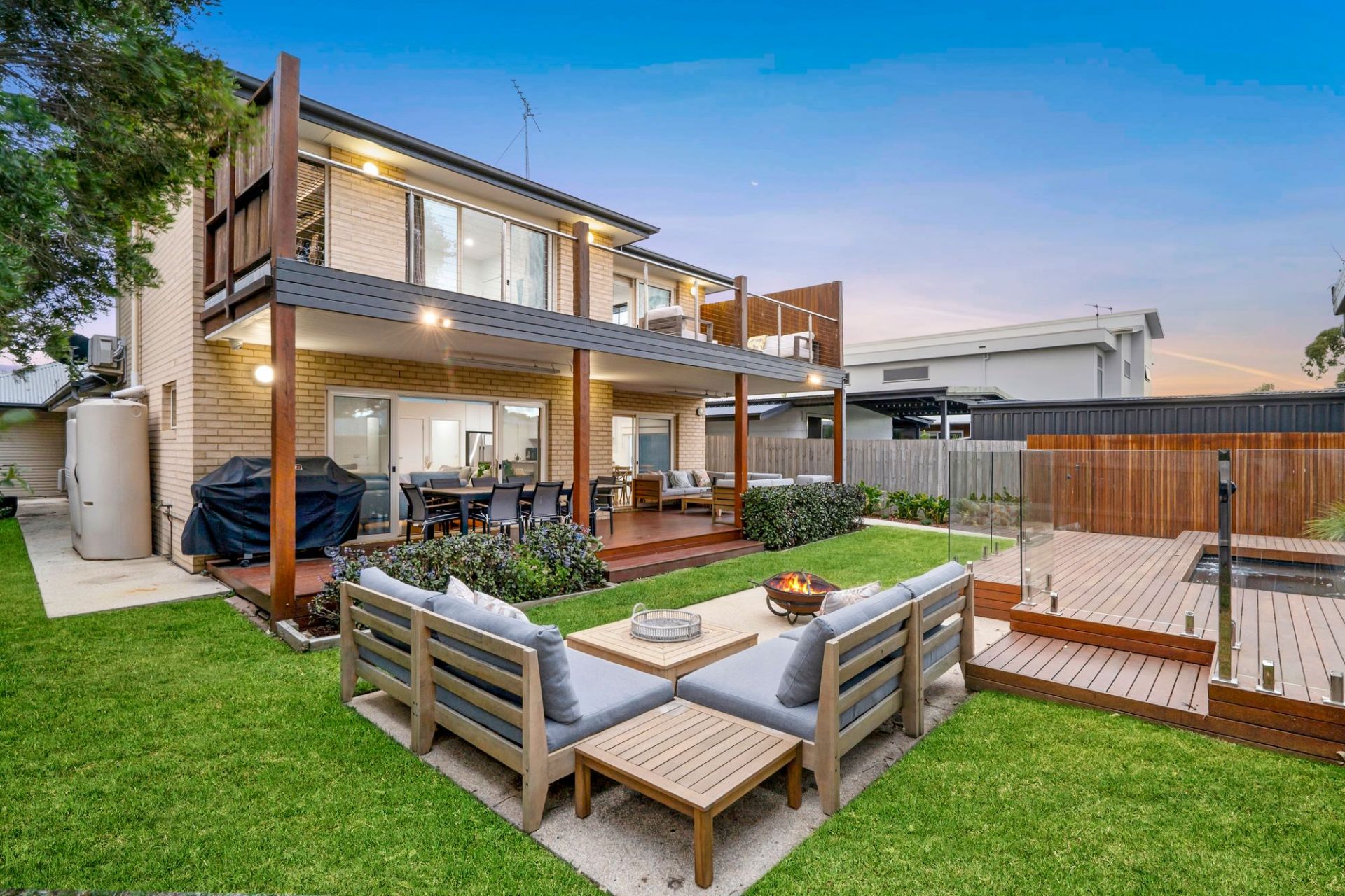 On the lower level, the front north-facing lounge room is bright and spacious. Two minor bedrooms, each with ample built-in storage, share the main bathroom with a bath and separate WC. The rear open-plan living area is the heart of the home, featuring a chef's kitchen with waterfall stone benchtops, stainless steel appliances, a walk-in pantry, and plenty of cabinetry. A glass splashback frames the garden view, while the dining space and primary lounge seamlessly connect to the rear yard, creating a perfect zone for entertaining. Flowing from indoors is the fabulous outdoor area. With undercover entertaining, lawn for kids or pets and a stunning mosaic-tiled 12-person spa, surrounded by decking and lush planting, offering a serene retreat.