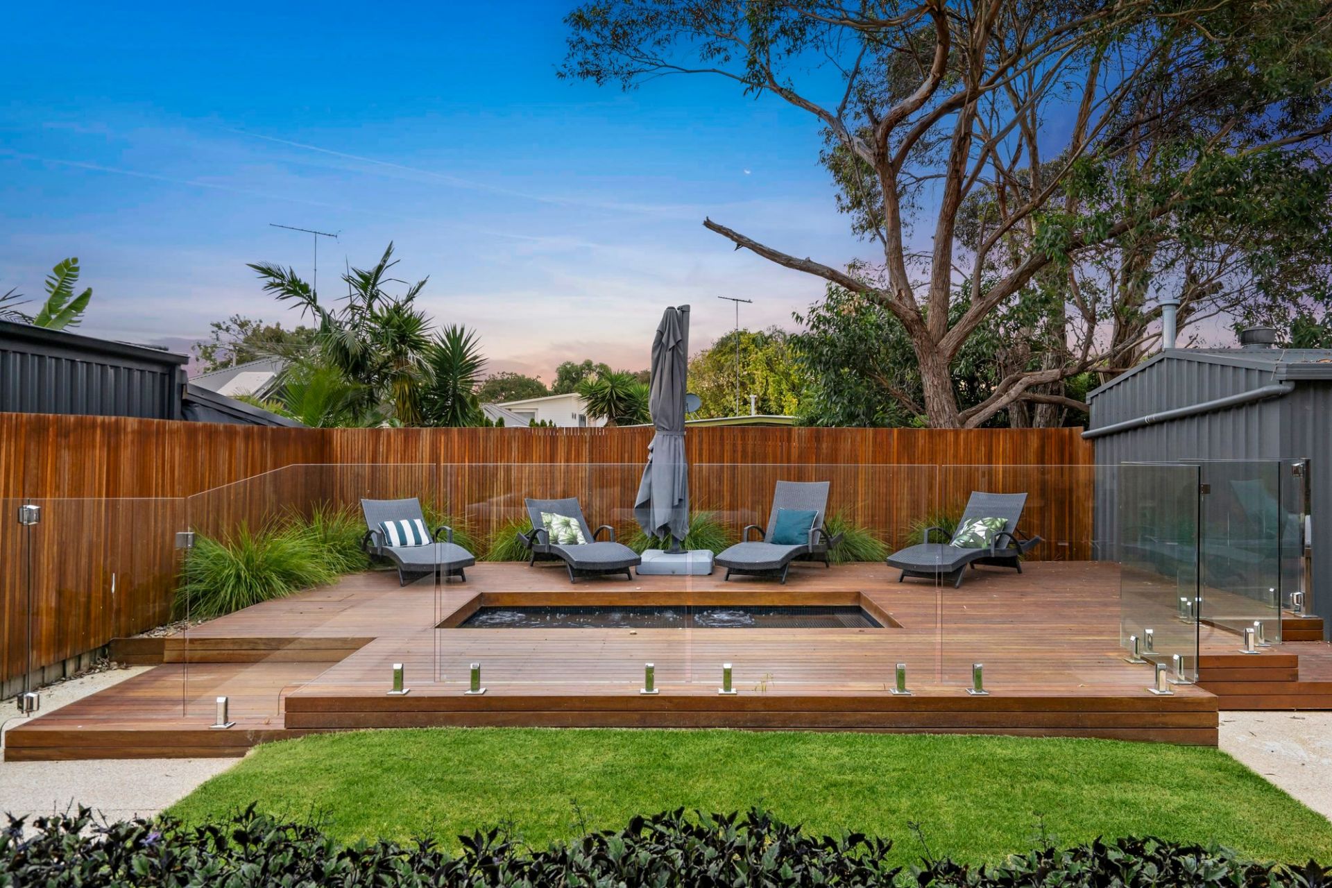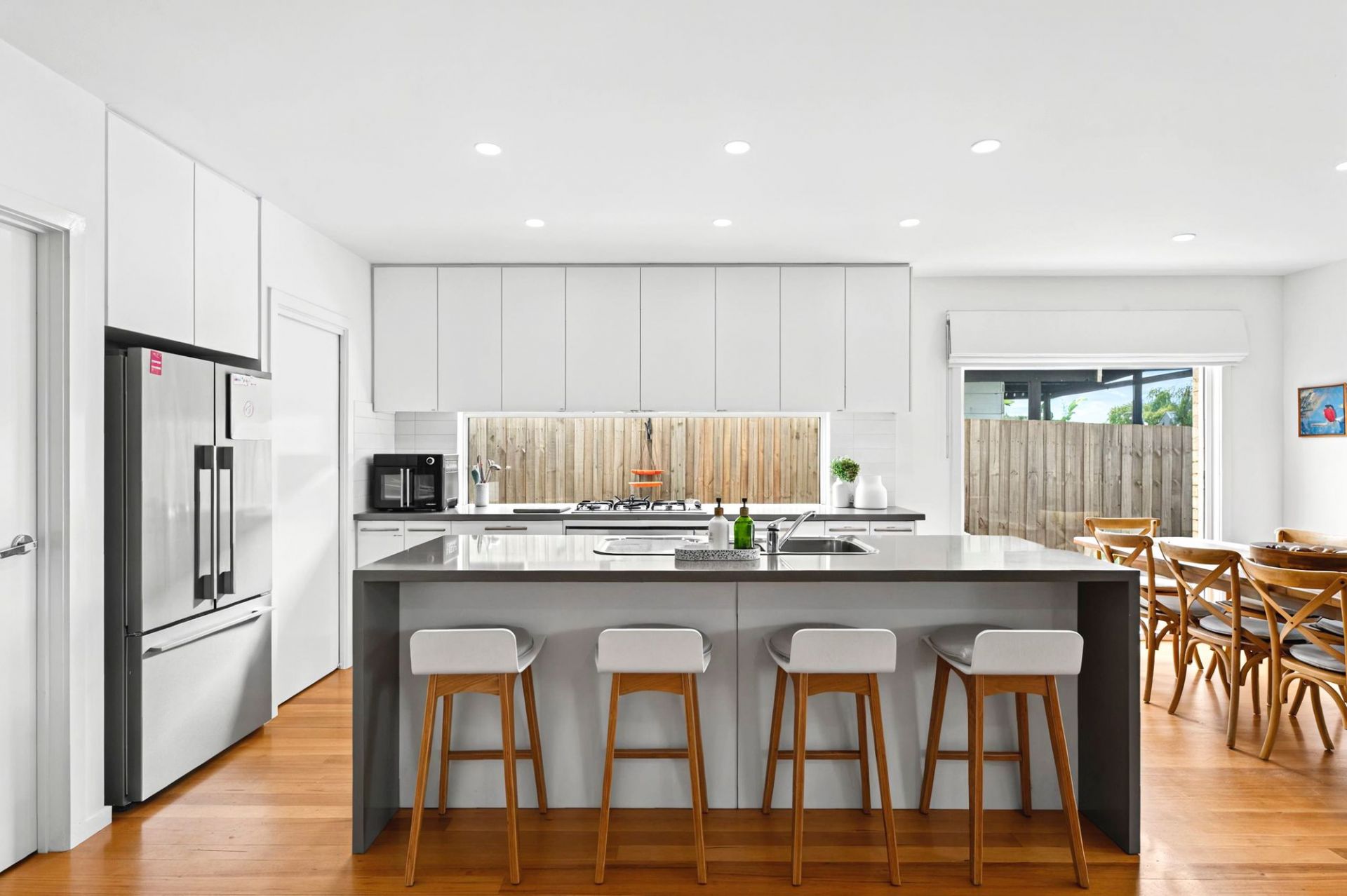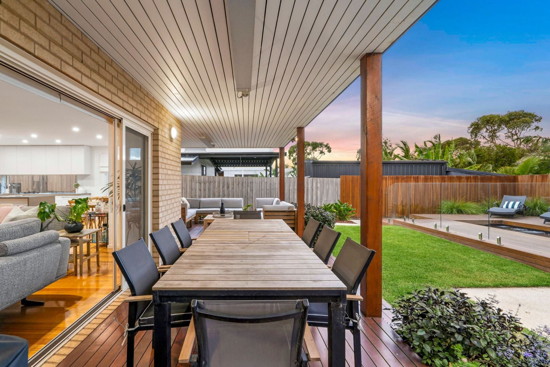 On the lower level, the front north-facing lounge room is bright and spacious. Two minor bedrooms, each with ample built-in storage, share the main bathroom with a bath and separate WC. The rear open-plan living area is the heart of the home, featuring a chef's kitchen with waterfall stone benchtops, stainless steel appliances, a walk-in pantry, and plenty of cabinetry. A glass splashback frames the garden view, while the dining space and primary lounge seamlessly connect to the rear yard, creating a perfect zone for entertaining. Flowing from indoors is the fabulous outdoor area. With undercover entertaining, lawn for kids or pets and a stunning mosaic-tiled 12-person spa, surrounded by decking and lush planting, offering a serene retreat.