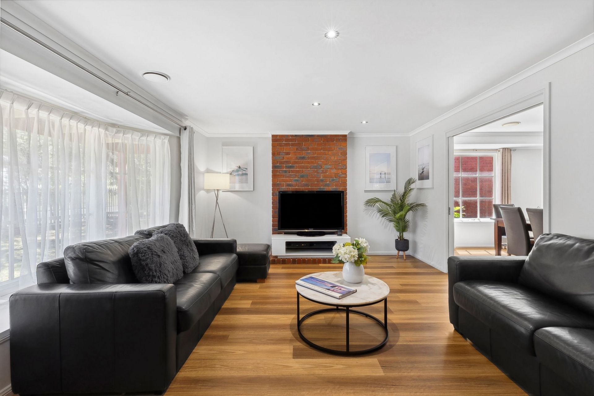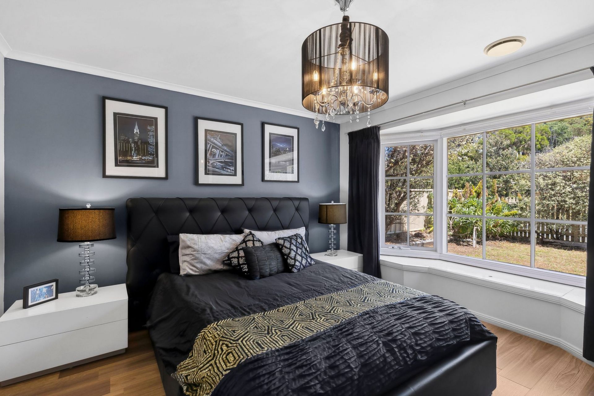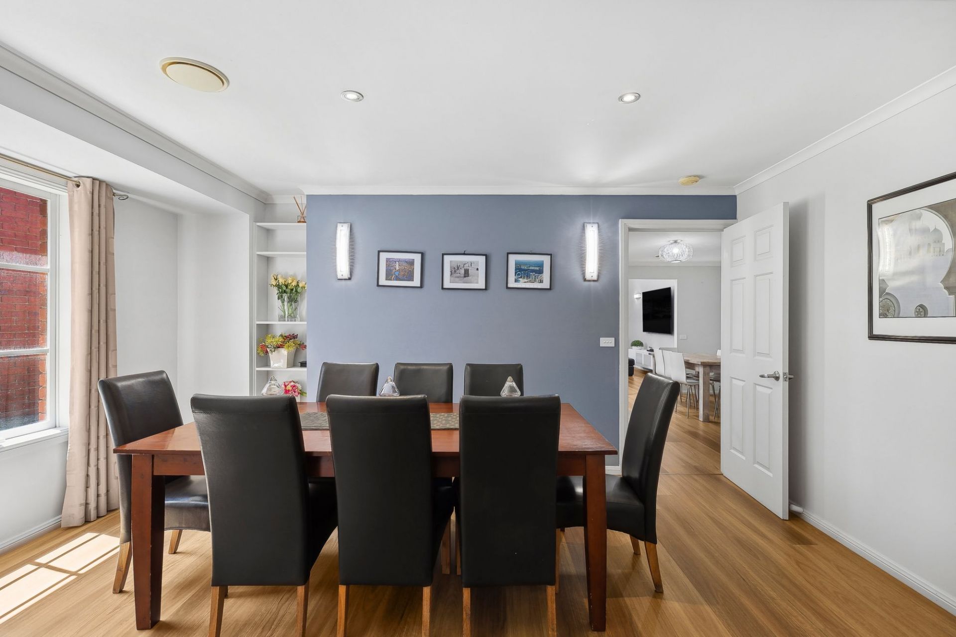 The master suite comes complete with a large bay window and window seat with built-in storage, built-in robes, and a spacious ensuite with a double vanity and lightwell. Two additional bedrooms with built-in robes share a polished family bathroom, while a centrally located study provides a quiet workspace.