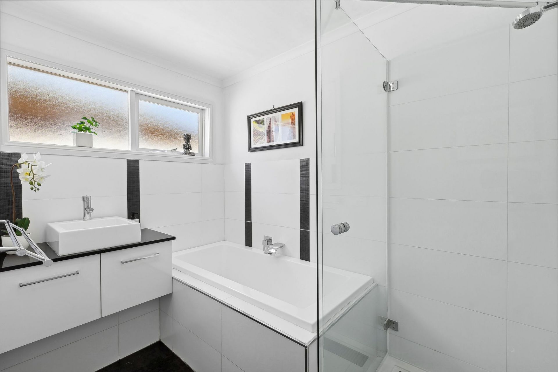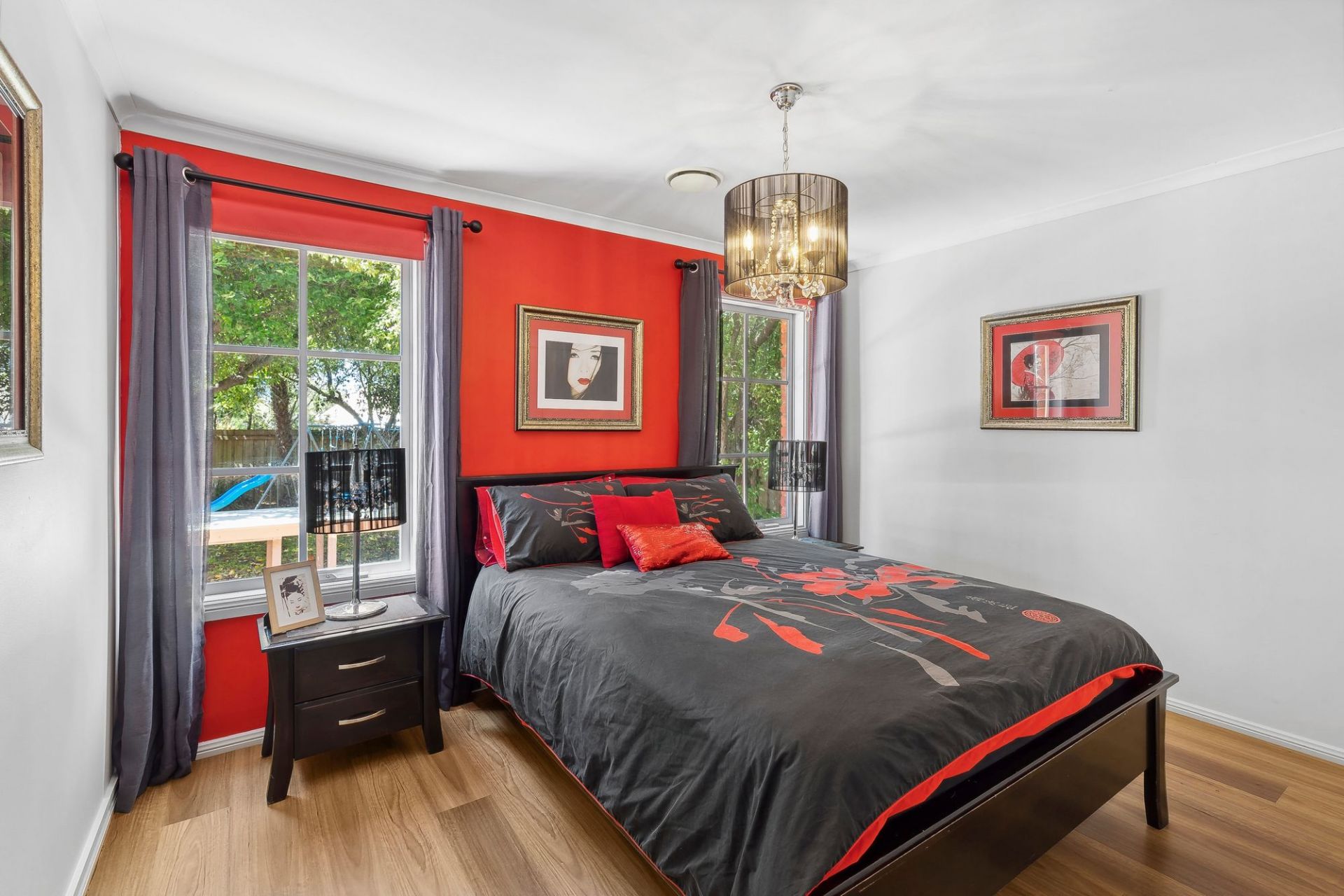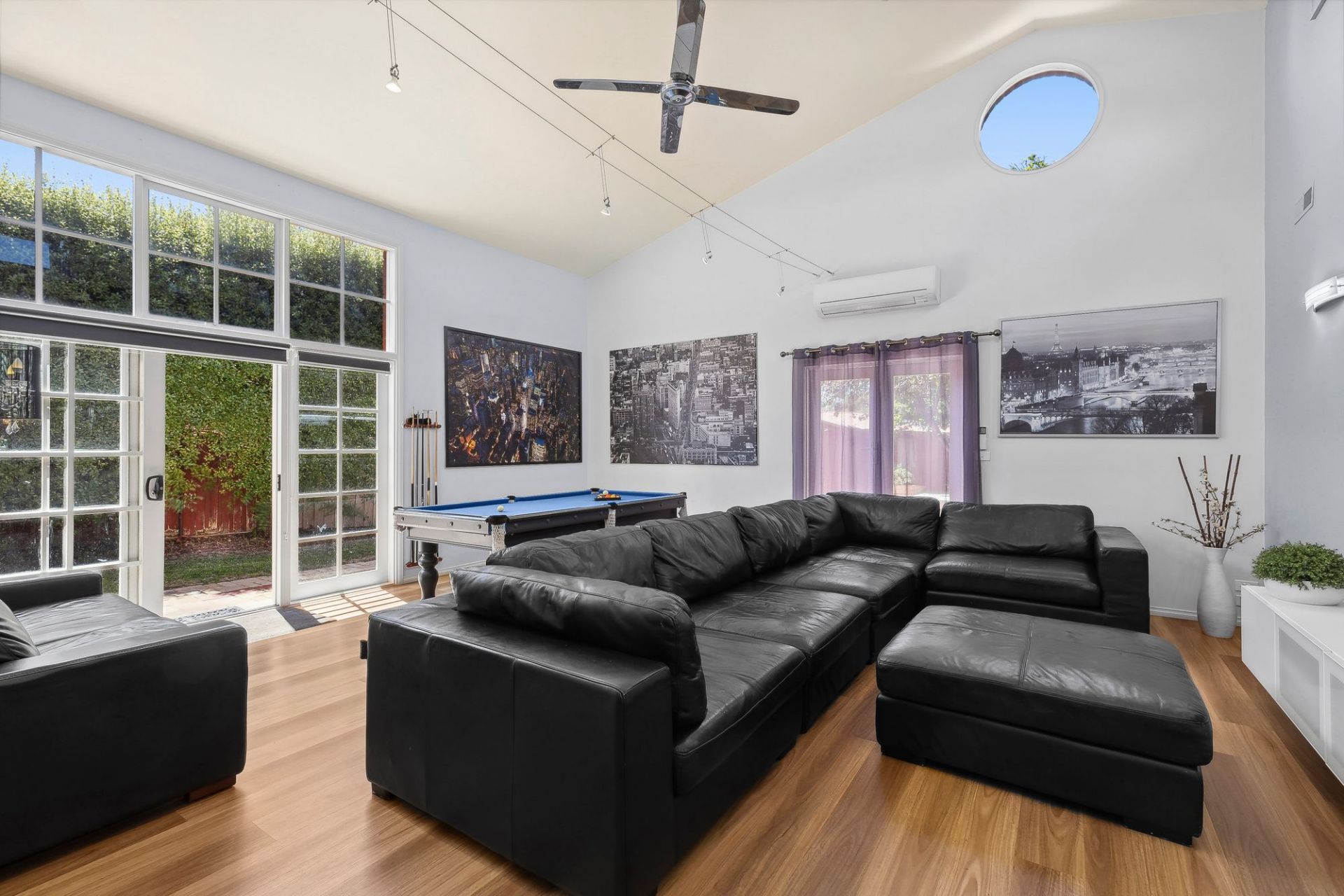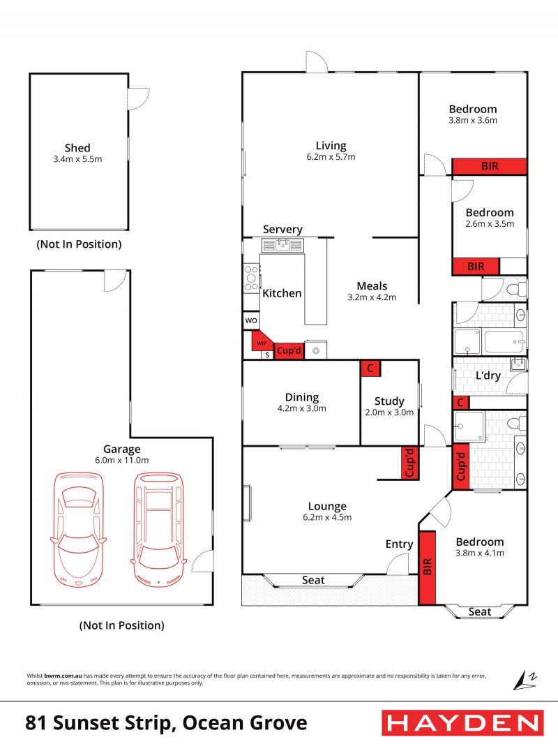 The master suite comes complete with a large bay window and window seat with built-in storage, built-in robes, and a spacious ensuite with a double vanity and lightwell. Two additional bedrooms with built-in robes share a polished family bathroom, while a centrally located study provides a quiet workspace.