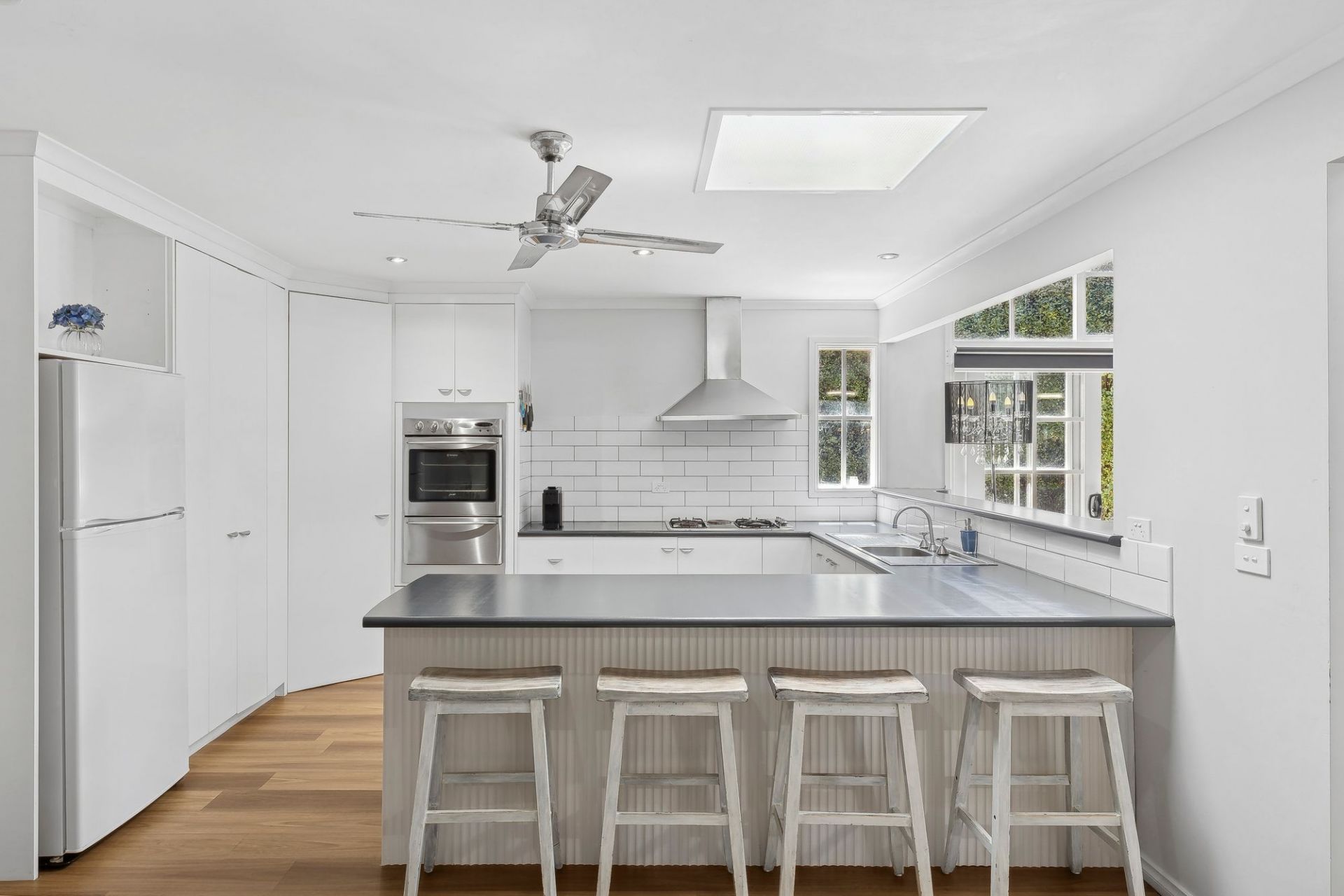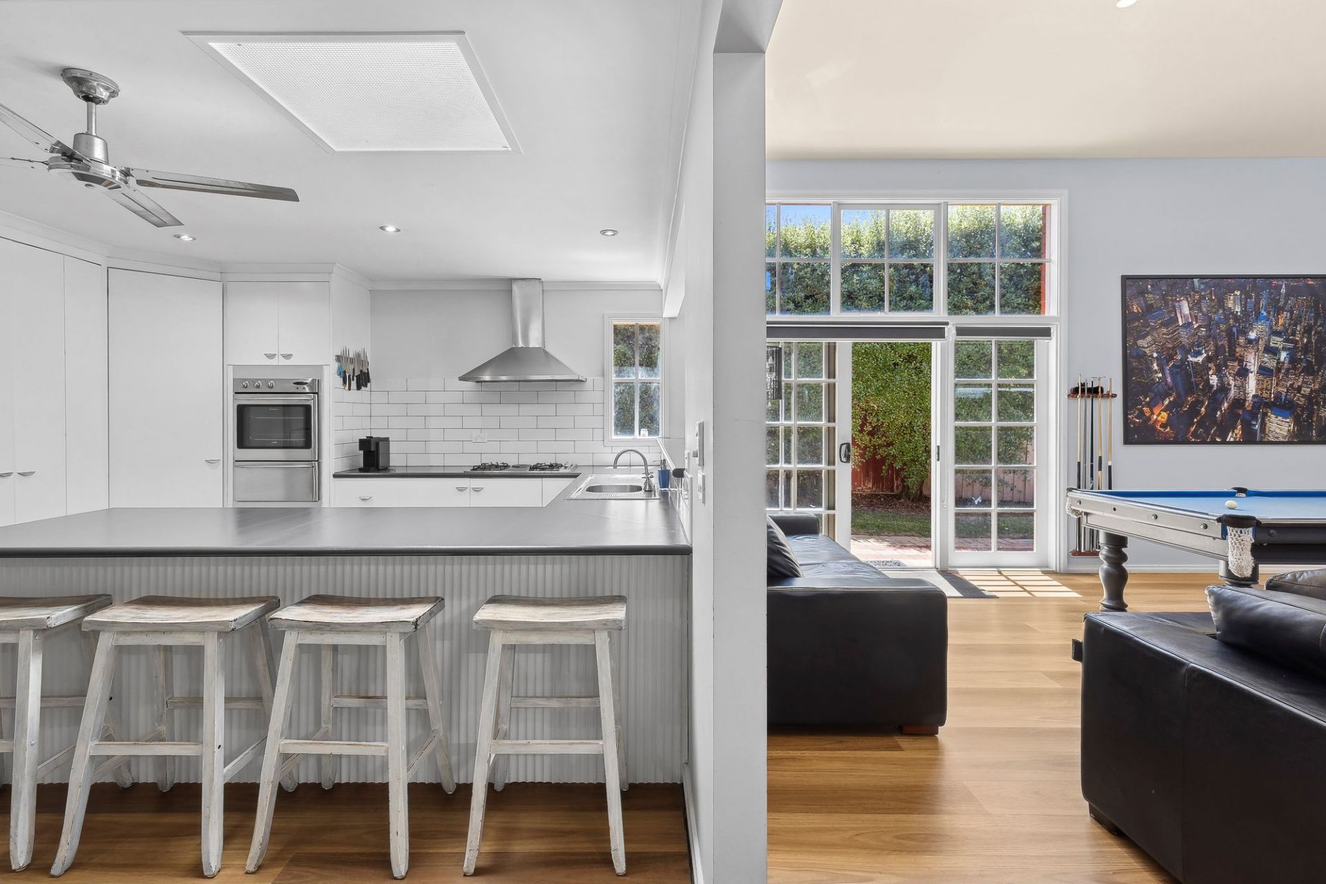 The thoughtful design incorporates dual living zones to cater to family life. At the heart of the home, the open plan living and dining area is bathed in natural light from soaring ceilings and high-set windows. The spotless C-shaped kitchen features a breakfast bar and open servery, modern appliances and a corner pantry, with a casual meals area directly opposite. A formal lounge and dining area at the front of the home offers versatility, with a charming bay window and window seat overlooking the established front garden.