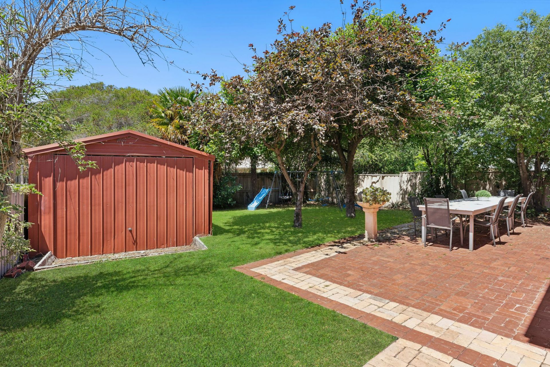 Outdoors, a paved alfresco area shaded by established trees invites summer entertaining. The triple-car garage with high ceilings is ideal for boat or caravan storage or a workshop for those in a trade, and a large garden shed adds practical storage. Ducted heating, timber-look flooring, and abundant storage throughout enhance the home's appeal.