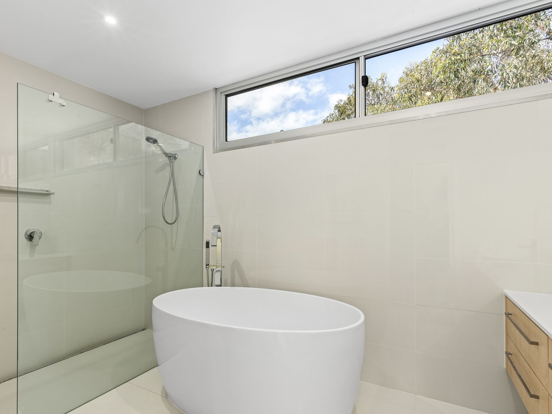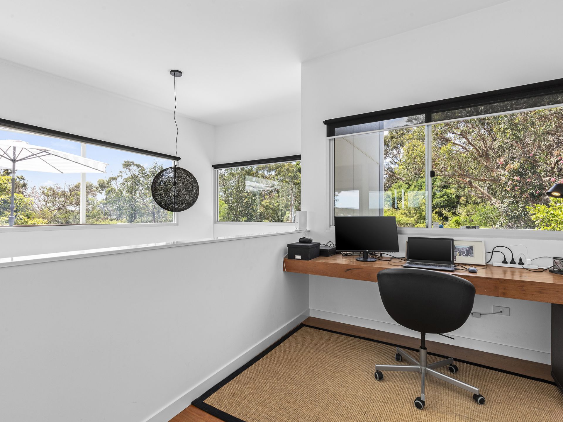 The upper level of the home features an open plan kitchen, living and dining space, featuring a large fireplace, and large upper windows that face north, brining in all of the warm natural light. The living and dining room also offer access to a spacious balcony. An open study is included upstairs, with a built-in desk that is perfect to suit your family’s needs. A powder room, second bathroom and master bedroom including a walk-in robe and access to the balcony is also included.