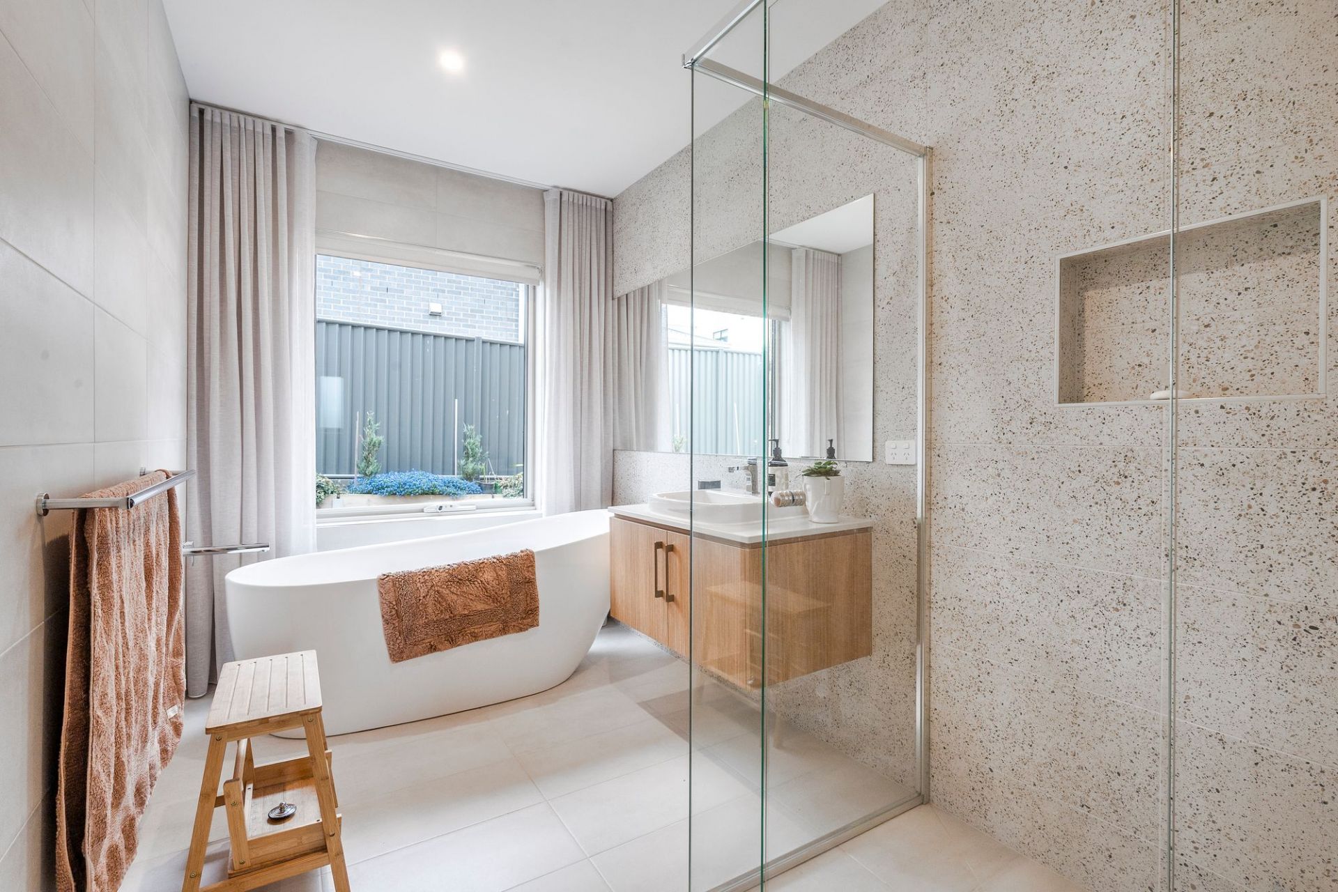 The lower level features a second lounge that flows out to a private, low-maintenance backyard - a tranquil space enhanced by elegant sheer curtains that diffuse natural light. A luxurious main bathroom includes an indulgent soaking tub, oversized shower, and sleek vanity. A large laundry and double remote garage with internal access add convenience to this stylish level.