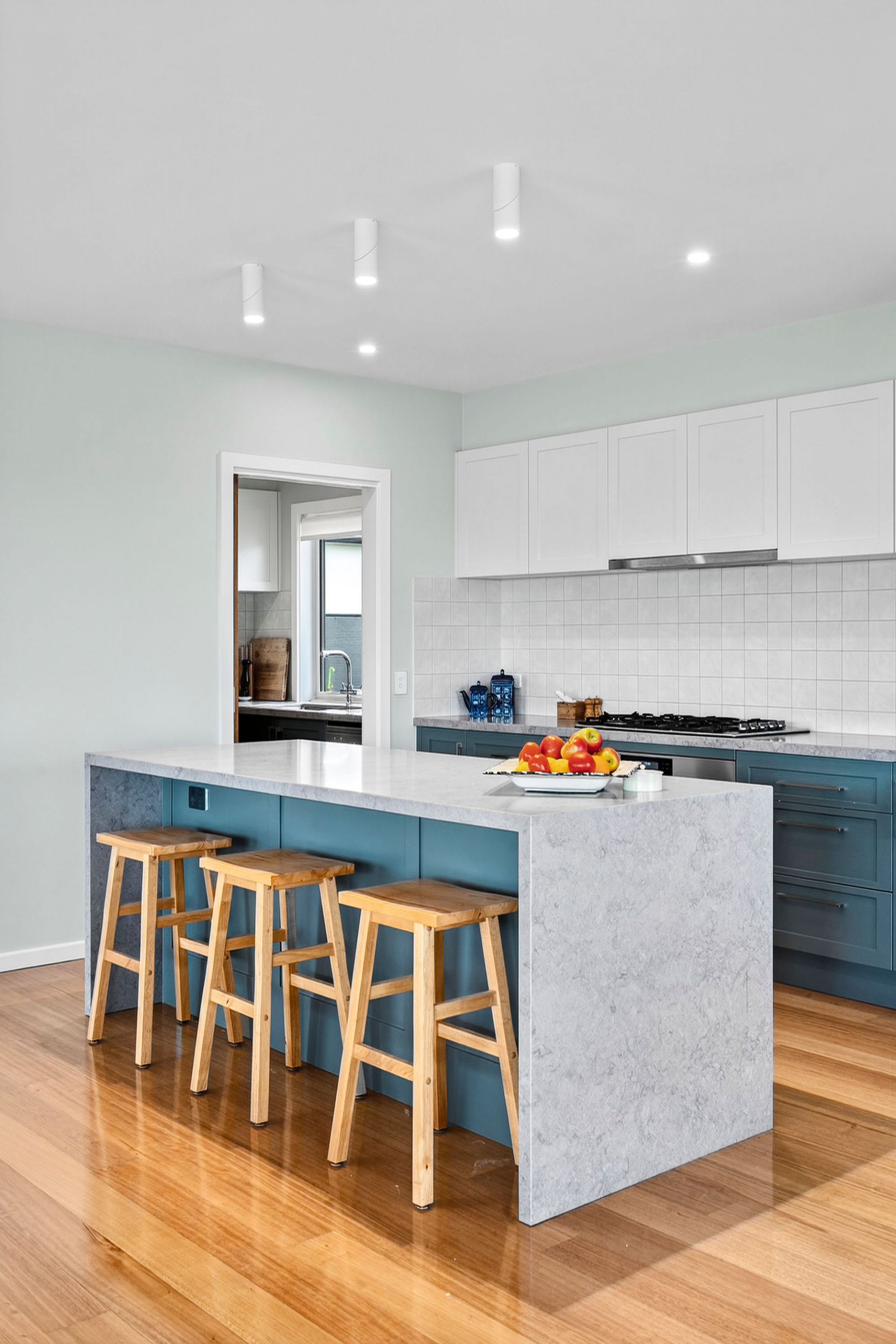 Upstairs is where the magic truly happens. The expansive open-plan living and dining area is bathed in sunlight, with panoramic north-facing views of the bay and Melbourne skyline framed by double-glazed windows. Premium hardwood floors add warmth and texture, while the gourmet kitchen impresses with a stone island bench, butler's pantry, and timeless colour palette that fuses function with elegance.