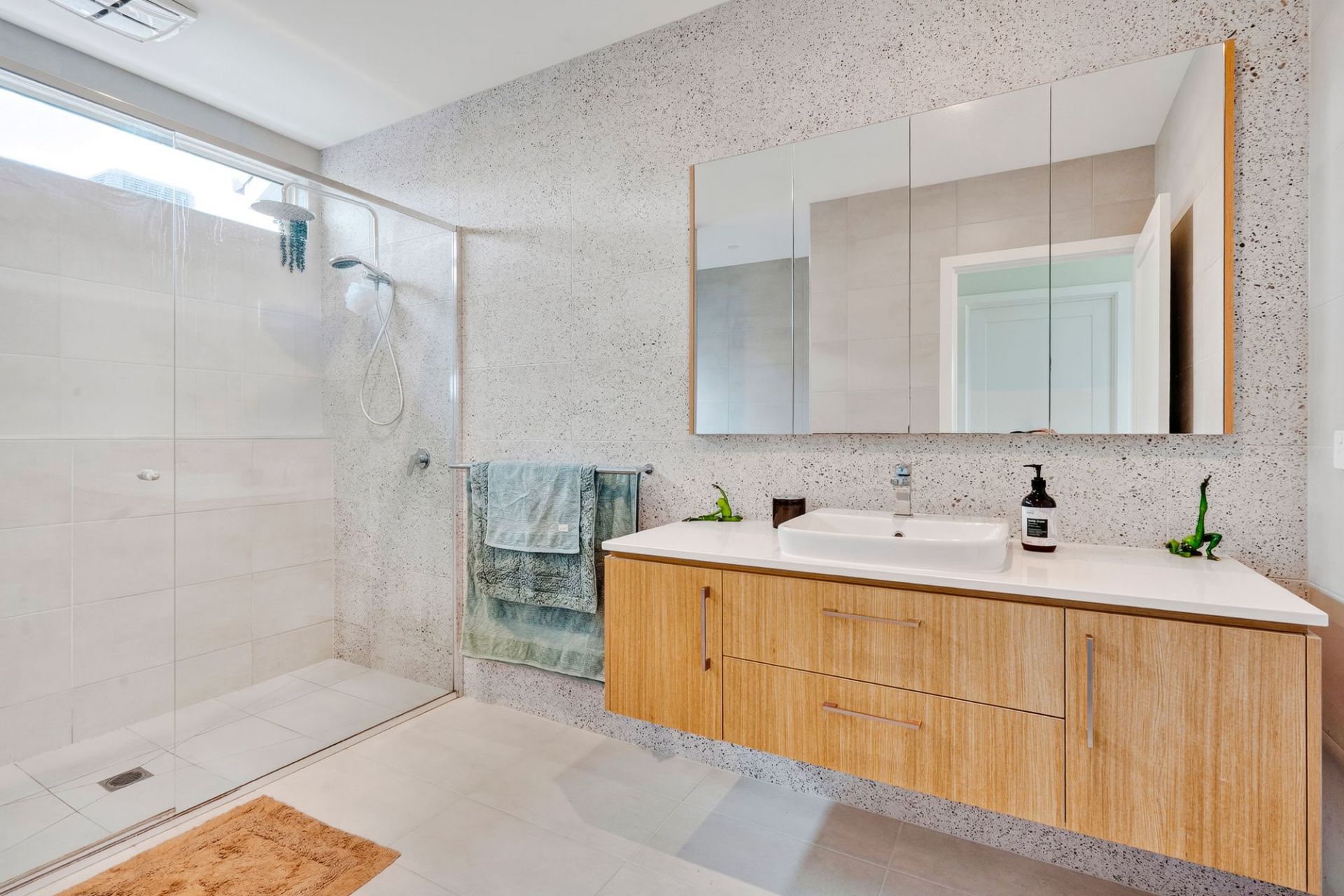 The master suite is your own private retreat, complete with flowing sheers, a walk-in robe, and a luxe ensuite featuring an oversized shower, floating vanity, and separate toilet - all with high-end finishes.